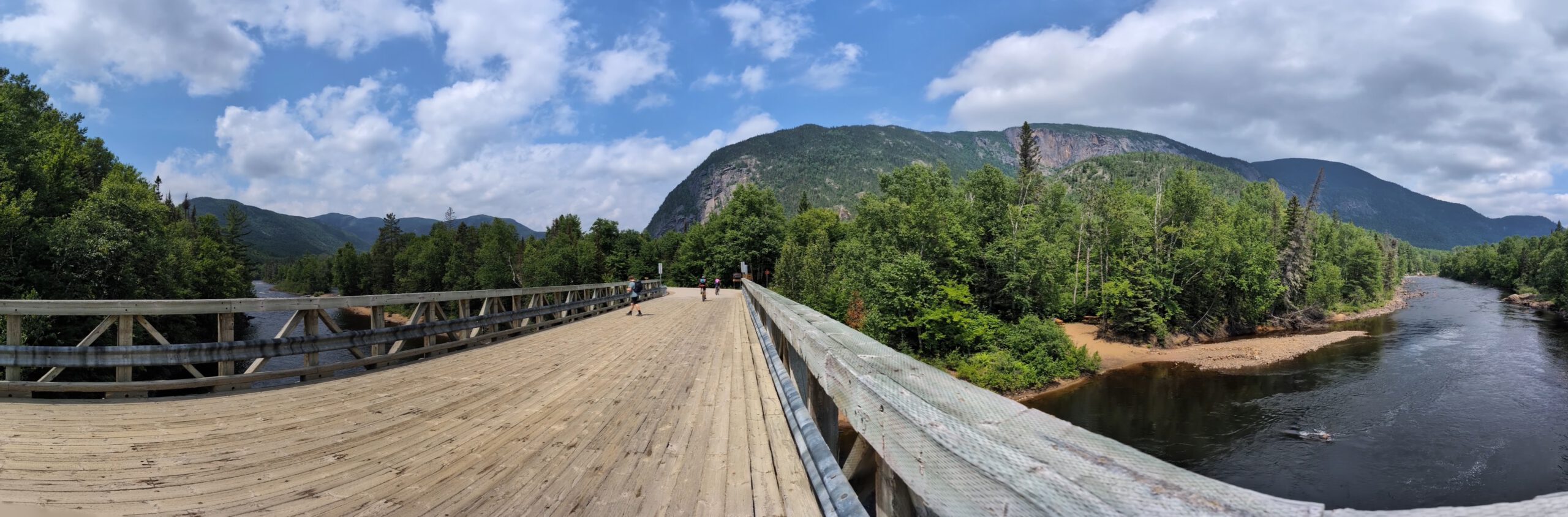 Wir hatten sowieso schon den Weg Les Rapides geplant, 8 Kilometer am Fluss entlang. Und mehr wäre heute auch nicht drin gewesen: 28 bis 30 Grad, hohe Luftfeuchtigkeit. Die Strecke selbst mäandert gemütlich am Wasser entlang, mal schlängelt sie sich durch den Wald, mal geht sie durch hohes Gras. Aber uns läuft der Schweiß. Und wir sehen wieder einen verdächtigen Haufen frischen Kot …