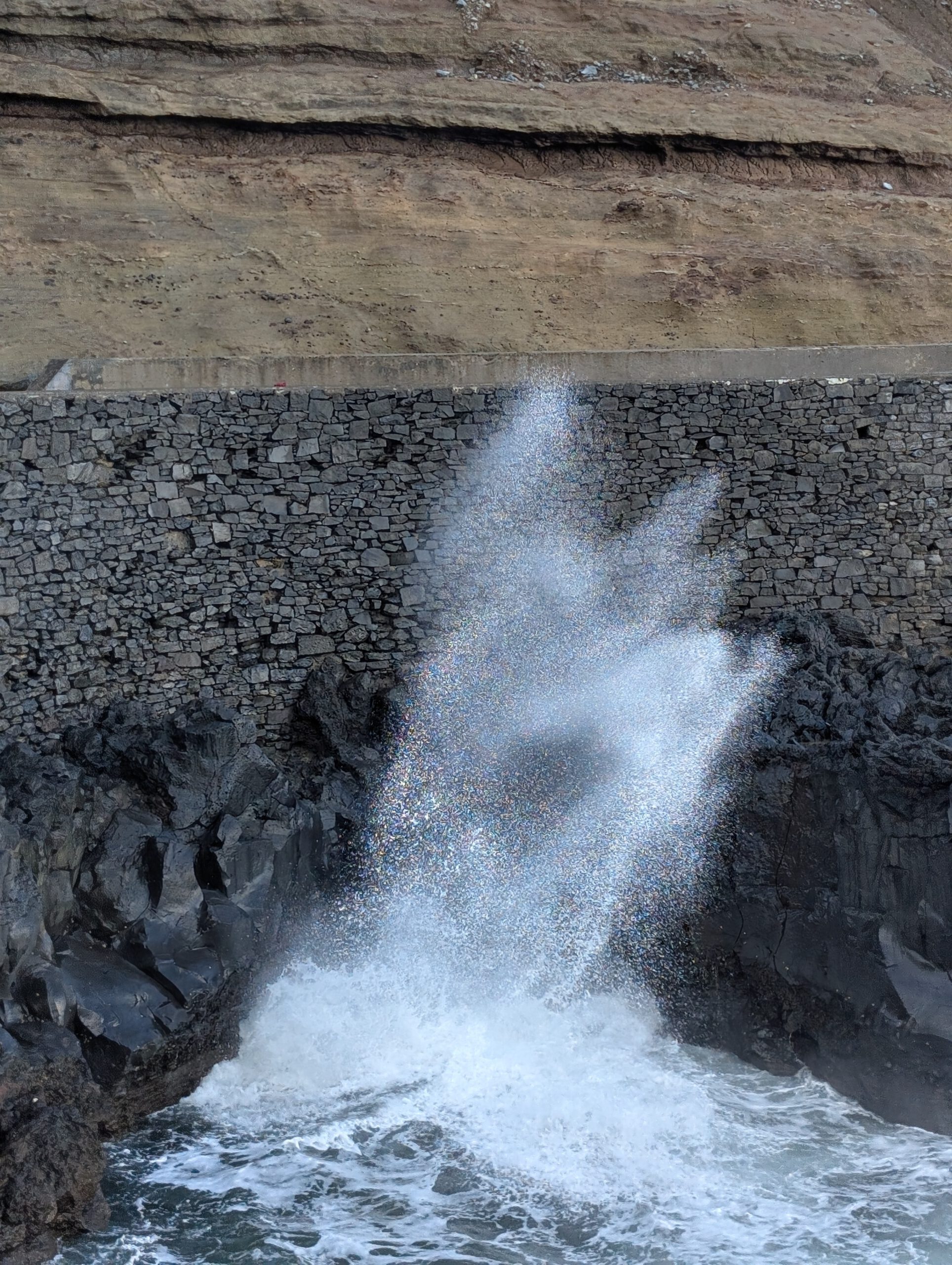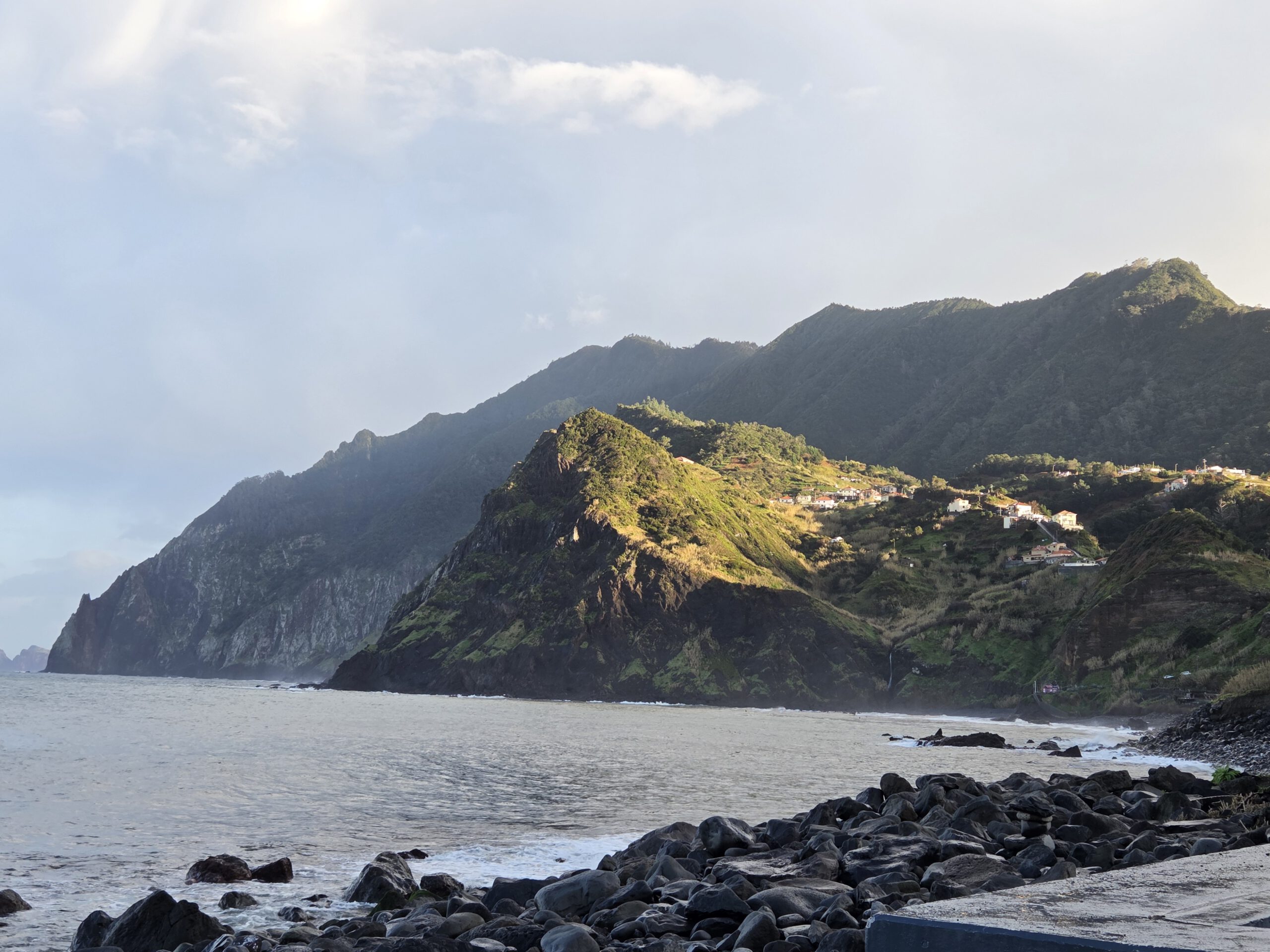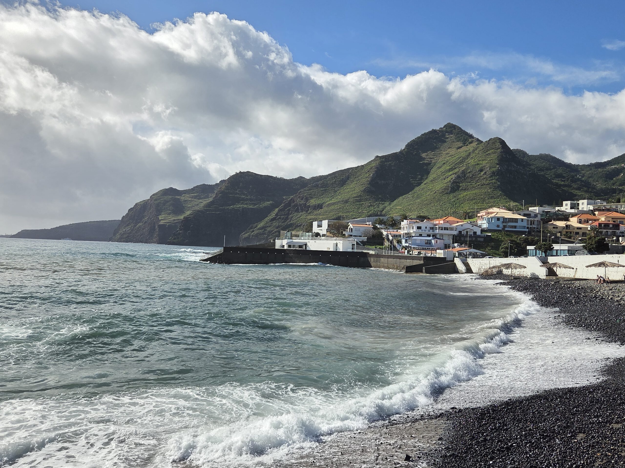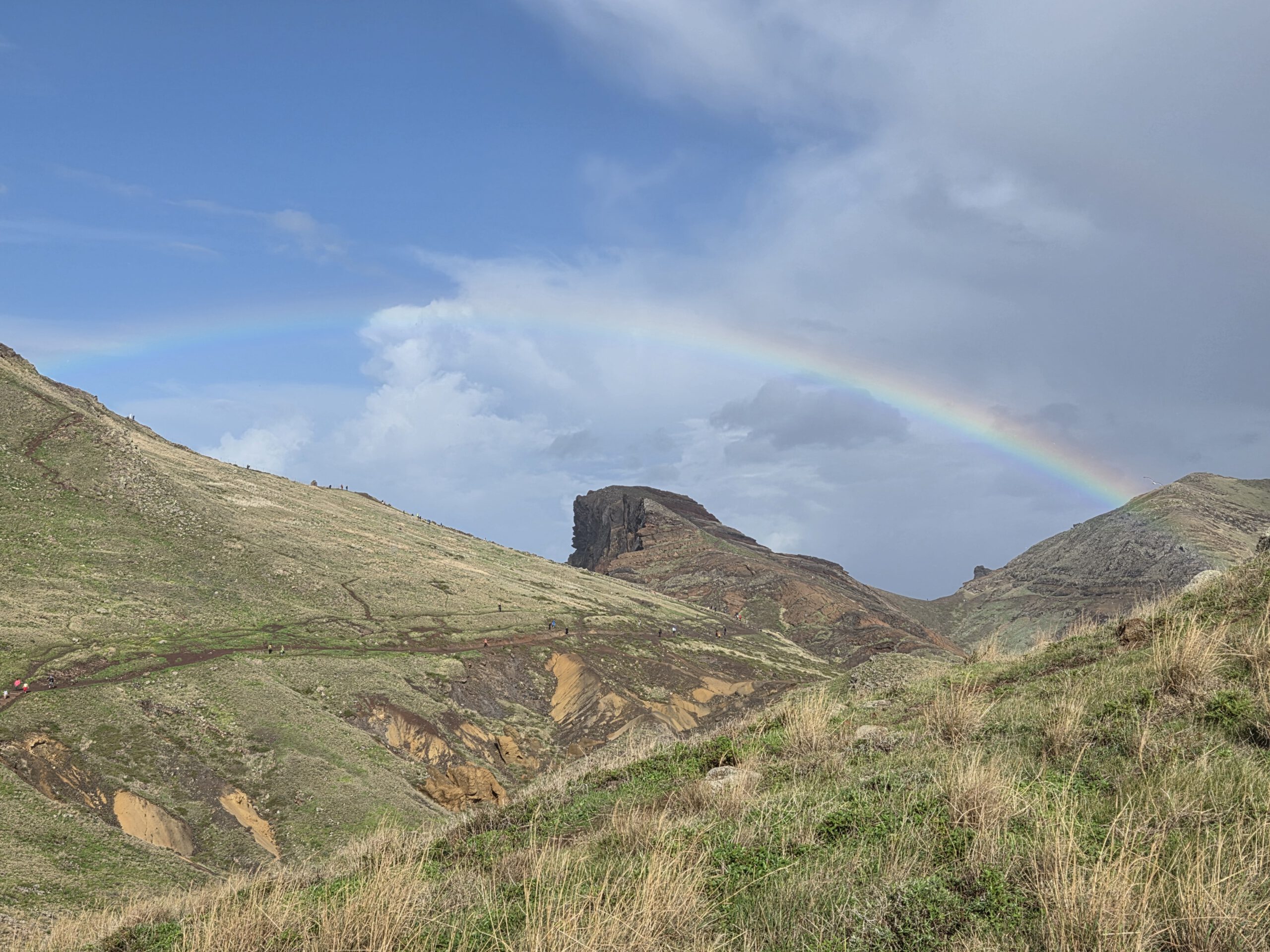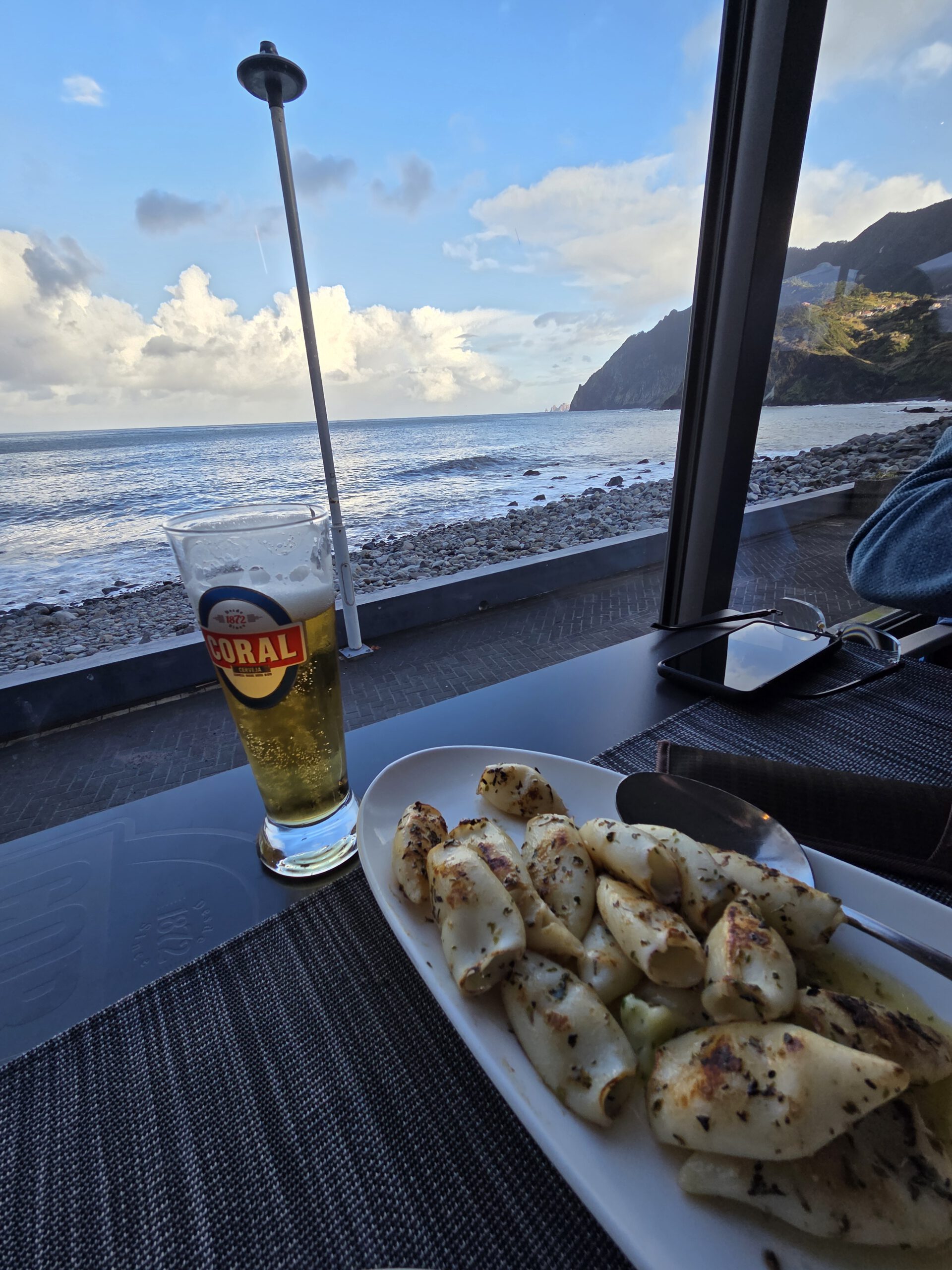 Nächster Blick auf die App, weiter geht es in den – sonst oft regnerischen – Norden, nach Porto da Cruz. Das Wetter hält! Gerald findet einen Parkplatz, wir gehen einen kleinen Rundweg um einen Felsen, bewundern Gesteinsformationen, ein Blowhole, durch das Wasser schießt, und den vierten Regenbogen des Tages. Als wir im Praca Velha für ein paar kleine Speisen einkehren, prasselt kurz der Regen, hört aber schnell wieder auf.