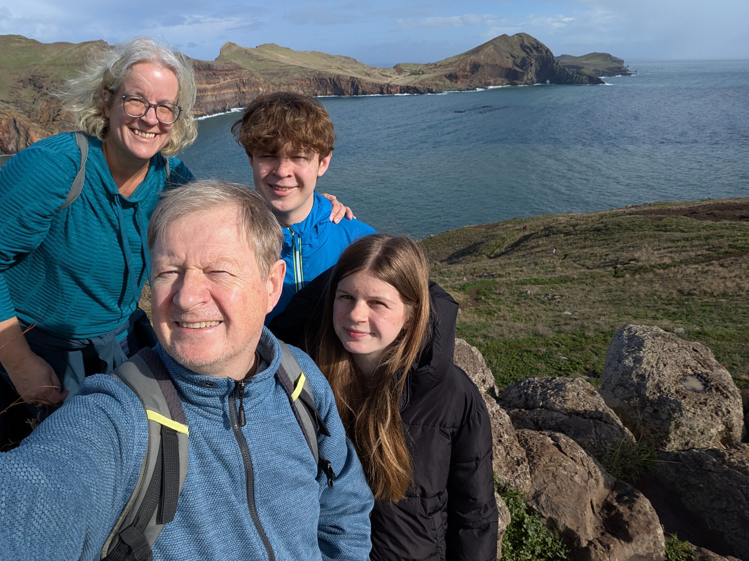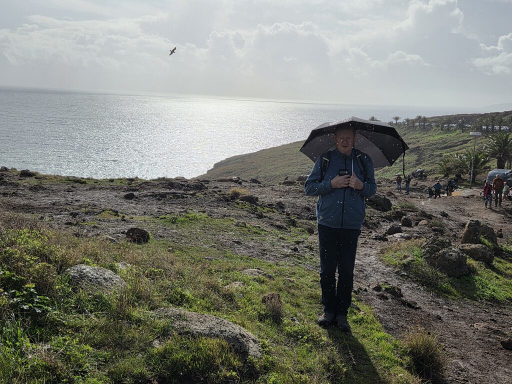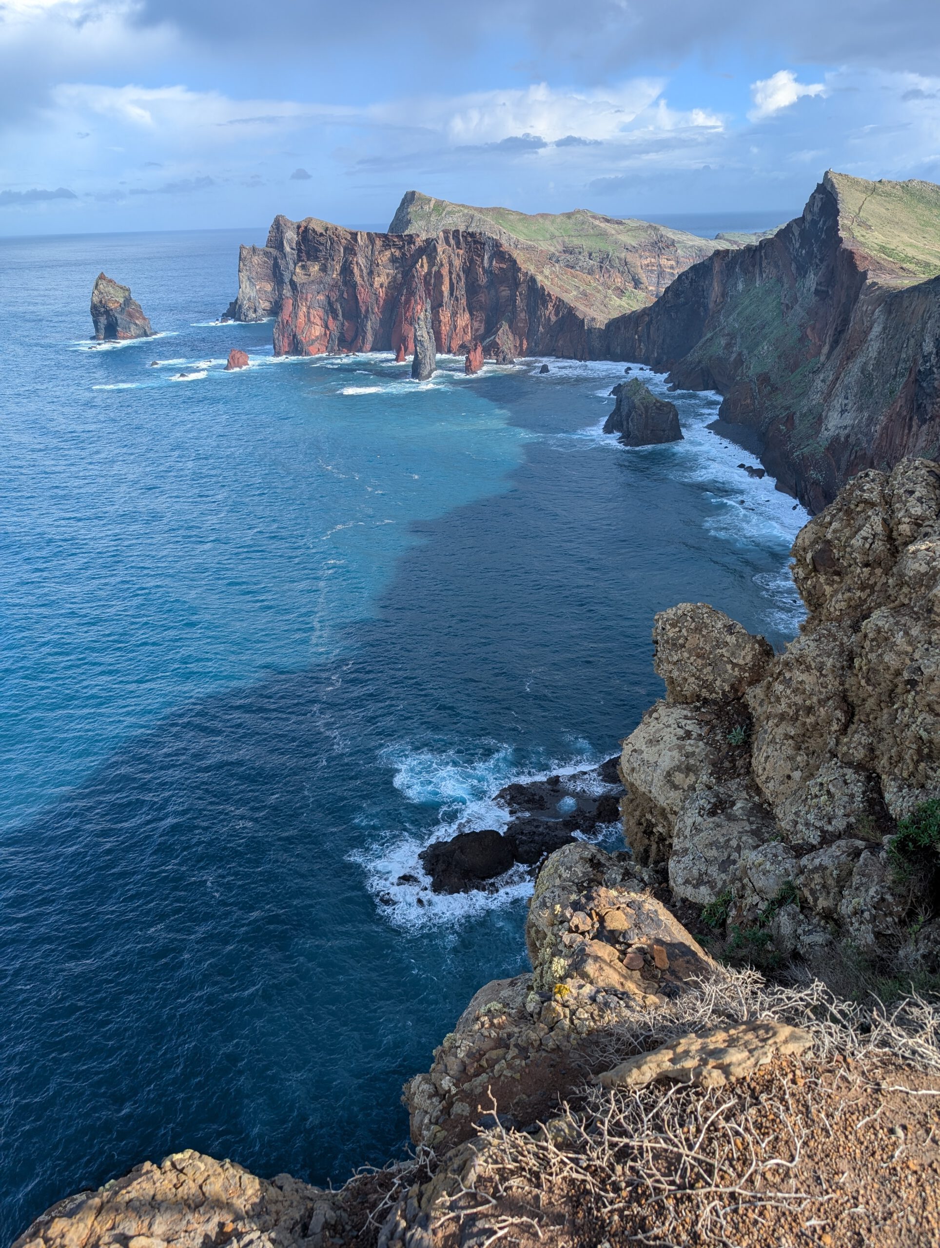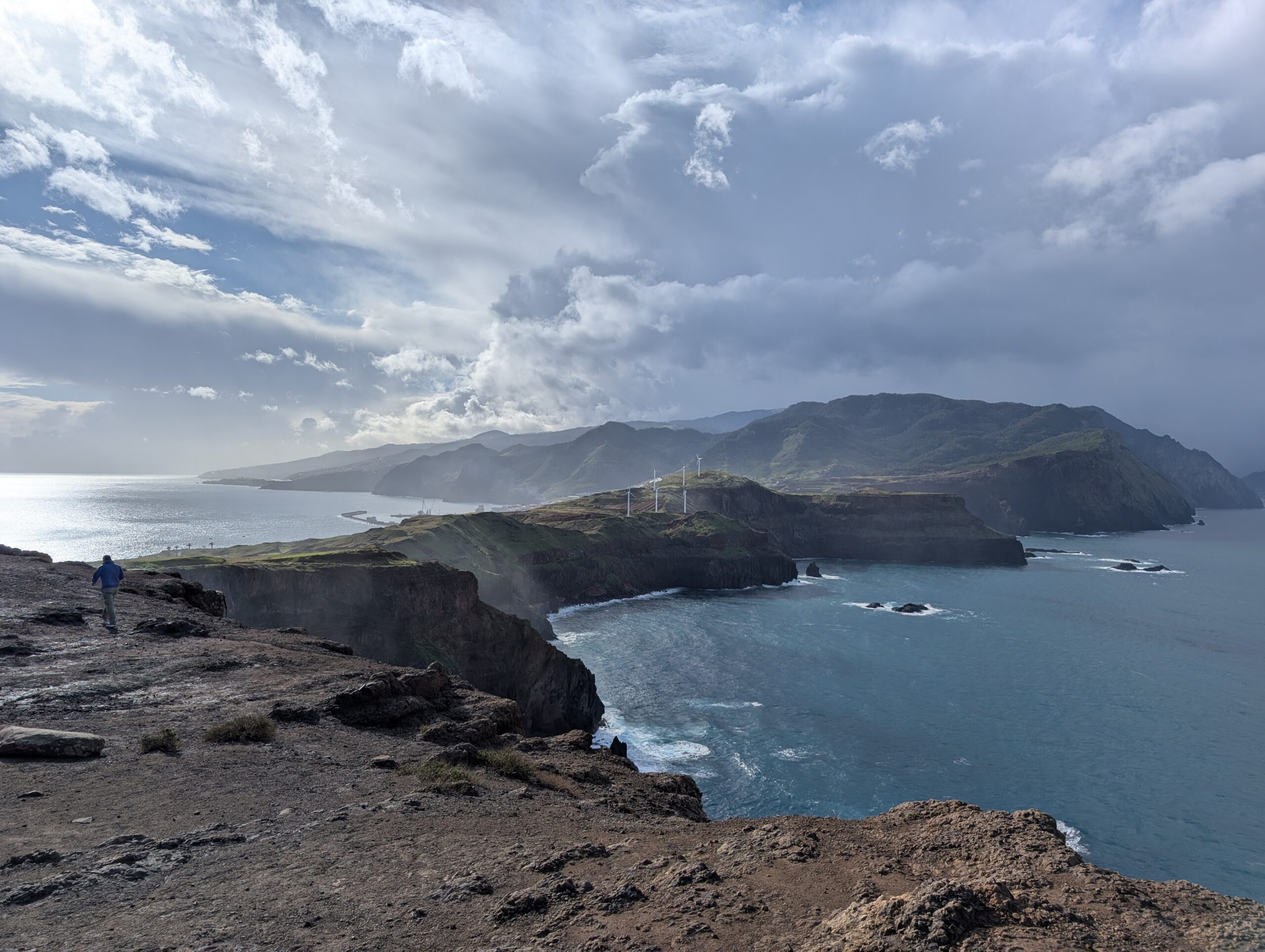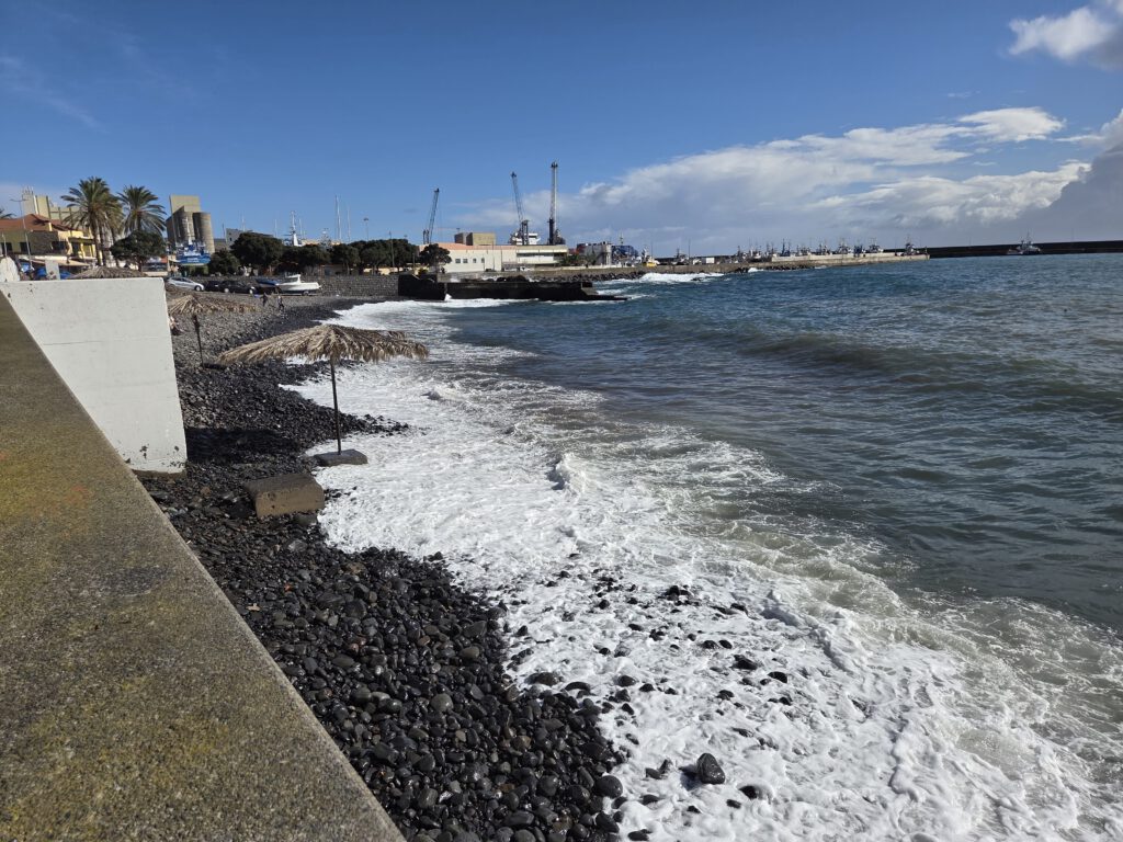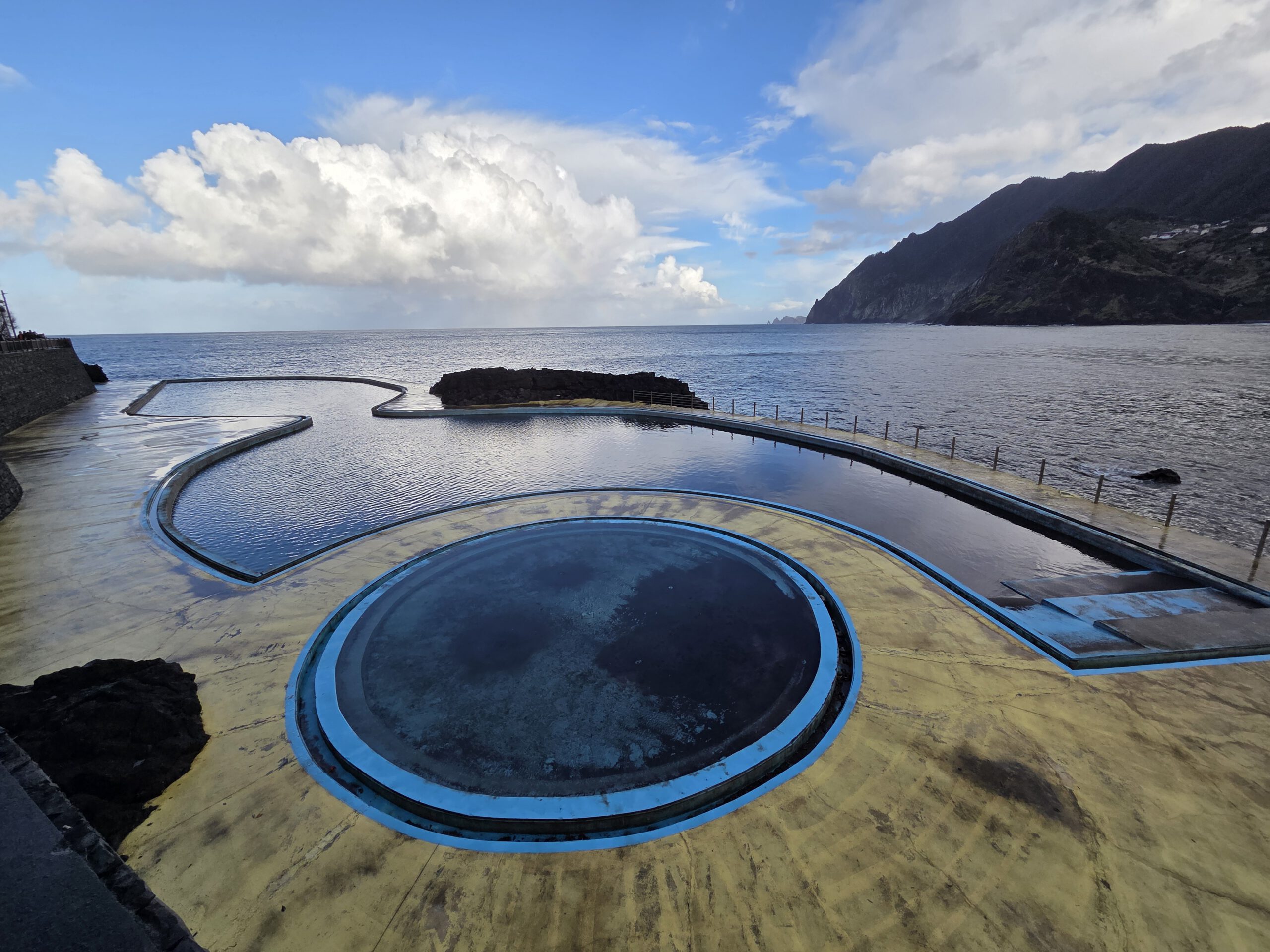 Nächster Blick auf die App, weiter geht es in den – sonst oft regnerischen – Norden, nach Porto da Cruz. Das Wetter hält! Gerald findet einen Parkplatz, wir gehen einen kleinen Rundweg um einen Felsen, bewundern Gesteinsformationen, ein Blowhole, durch das Wasser schießt, und den vierten Regenbogen des Tages. Als wir im Praca Velha für ein paar kleine Speisen einkehren, prasselt kurz der Regen, hört aber schnell wieder auf.