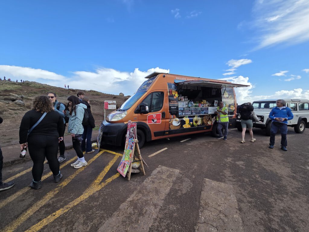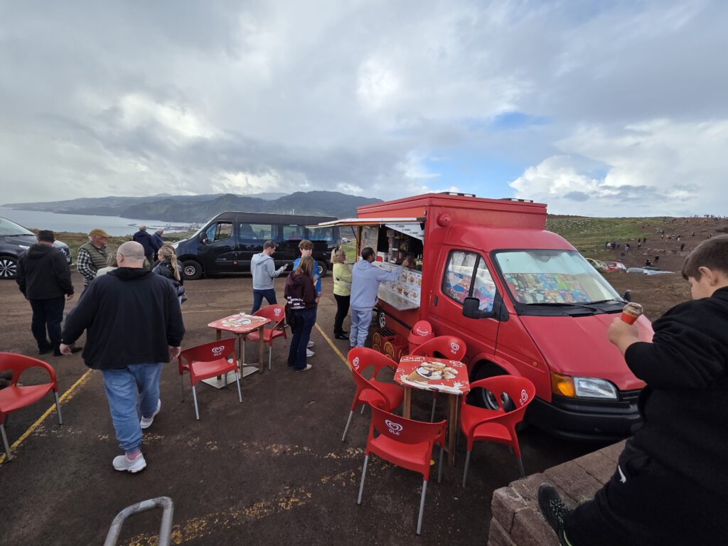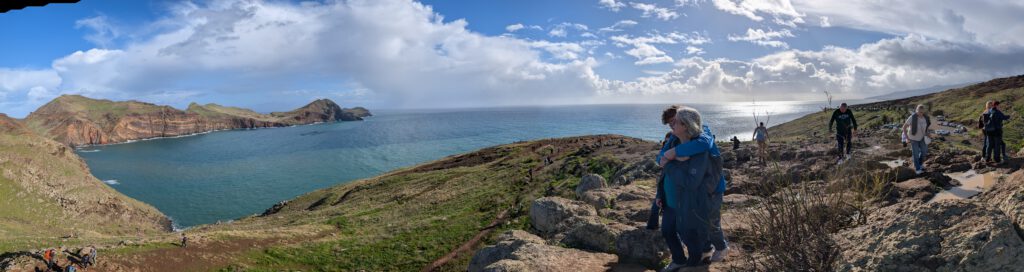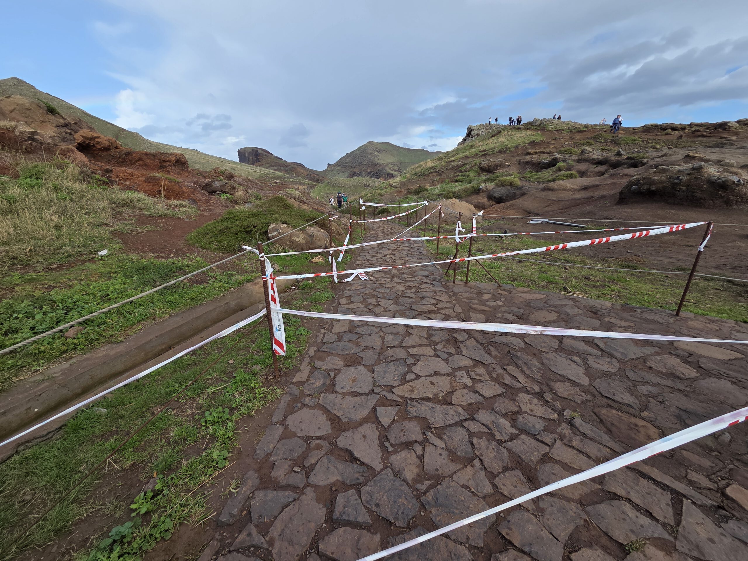 Nächster Stopp: Der Zugang zur Halbinsel Ponta do Sao Lourenco, eine vierstündige Wanderung würde zur östlichen Halbinsel führen. Diese Wanderung war eine der ersten auf der Insel, für die man zahlen musste. Seit 1.1.2026 gilt das ja für fast alle, digital Zeitfenster buchen und bezahlen. Aber heute ist der Weg, vermutlich wegen der noch geltenden Windwarnung, mit Flatterband abgesperrt. Sogar mit einer Strafe von 2500 Euro bei Missachtung wird auf einem Schild gedroht. Was aber mehrere hunderte Wanderer, die wir aus der Ferne sehen, wohl nicht abgehalten hat. Als wir dort sind, positionieren sich gerade zwei Parkwächter in Shorts und Leibchen und halten die jetzt eintreffenden Wanderer vom Weg ab. Wie lange das noch dauert und warum eigentlich wissen sie jetzt auch nicht so genau, aber …