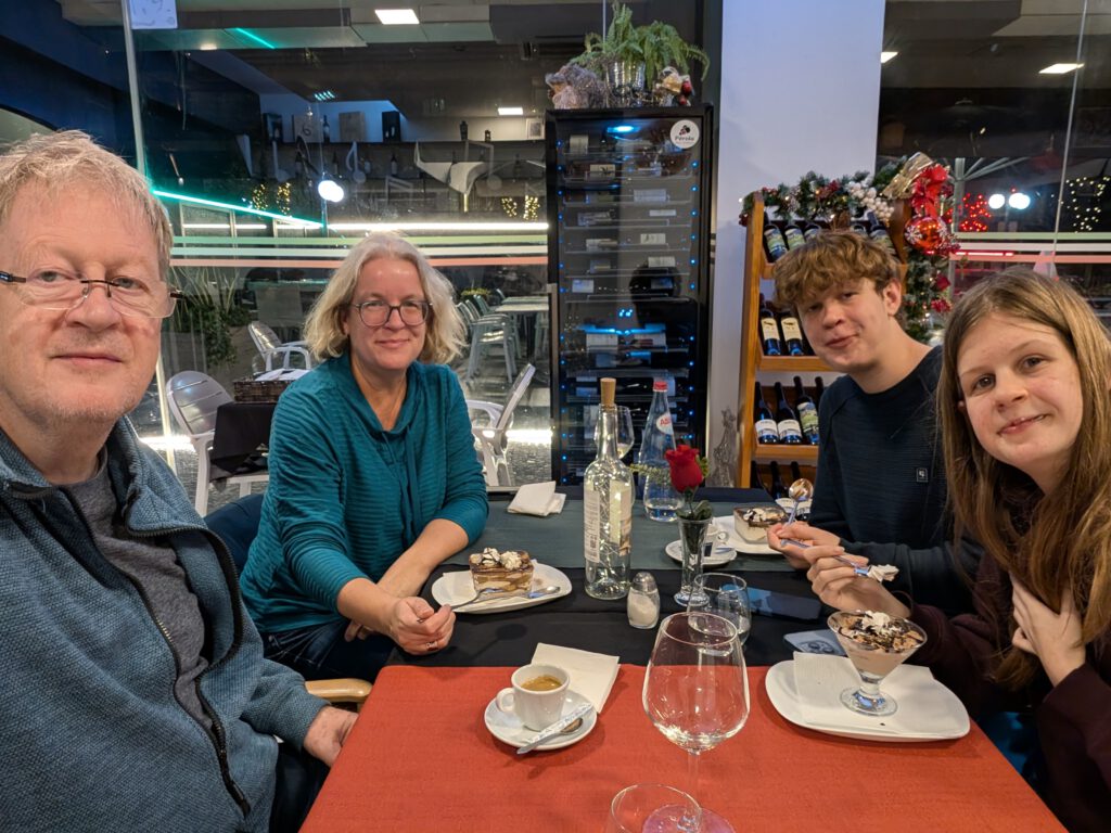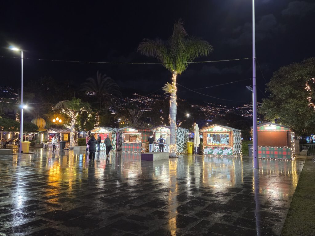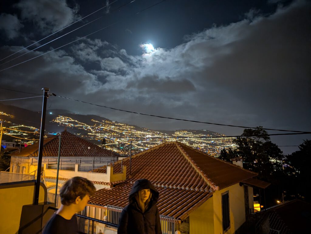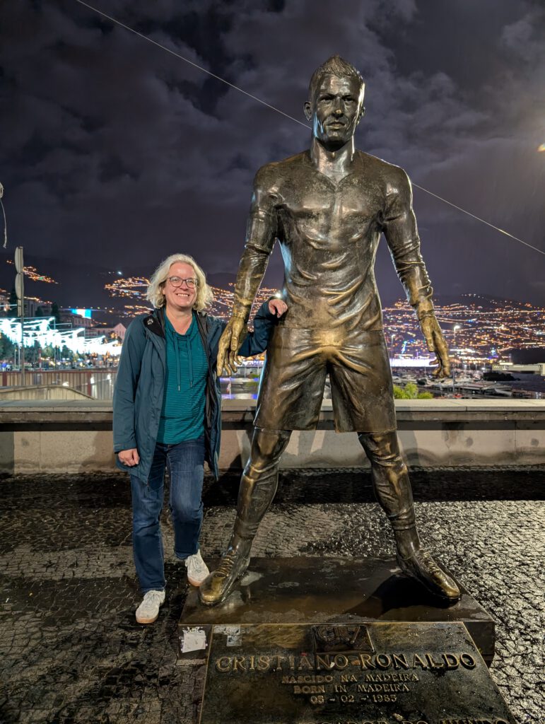 Da es unser letzter Abend in der Stadt ist, ziehen wir vor allem auf Wunsch von Kilian nochmal los. Auf dem steilen Weg bergab bekommen Louisa und Nicole auf einmal Licht aus dem Handy einer jungen Portugiesin – sie sollen doch bitte gut aufpassen, es ist rutschig. Als man ihr den Weg frei machen will, lacht sie nur – sie sei das doch gewohnt! Und ist schnell in der Dunkelheit verschwunden. Wir schlendern durch den Weihnachtsmarkt, nochmal zum großen blinkenden Christbaum am Kai. Dort ist inzwischen die Bühne abgebaut, auch die Maroniverkäufer fehlen. Die Jungs entscheiden, dass wir Richtung Hotelzone laufen, dort waren wir noch nicht. Also ein paar Kilometer am Meer entlang, Fotostopp beim Inselheiligen Cristiano Ronaldo. Dann einen steilen Berg hoch an teuren Hotels vorbei, doch nicht in eines der Restaurants direkt vor Ort, aber in einen kleinen Italiener. Unverwüstlicher Italopop dröhnt aus den Lautsprechern und es gibt Salat!!!! Grünzeug! Plus Pizza und Nudeln und Tiramisu. Ein schöner Abschluss. Als wir den Berg zu uns hochlaufen fängt es wieder an zu tröpfeln. Immerhin 16.000 Schritte, gut 13 Kilometer.