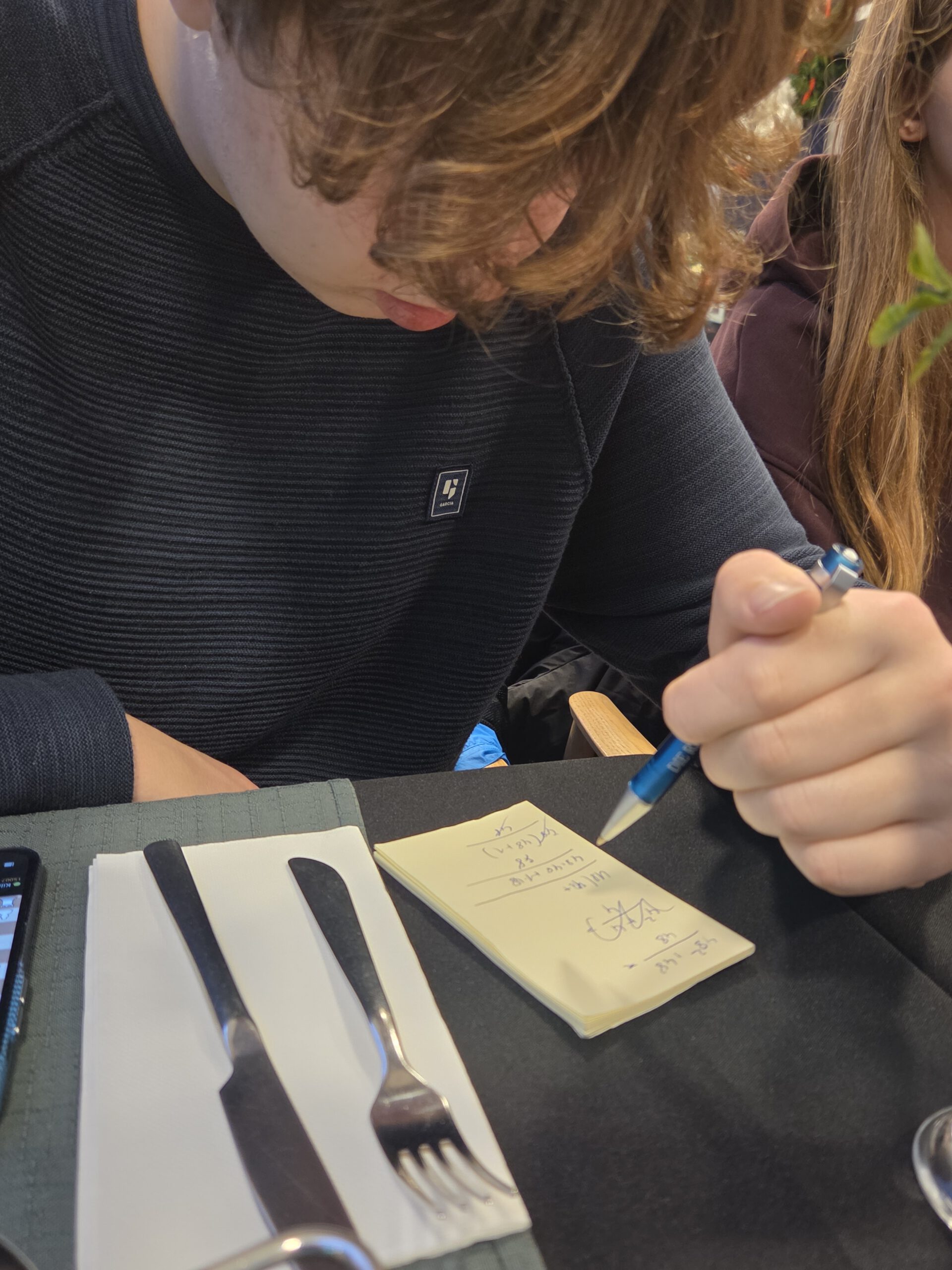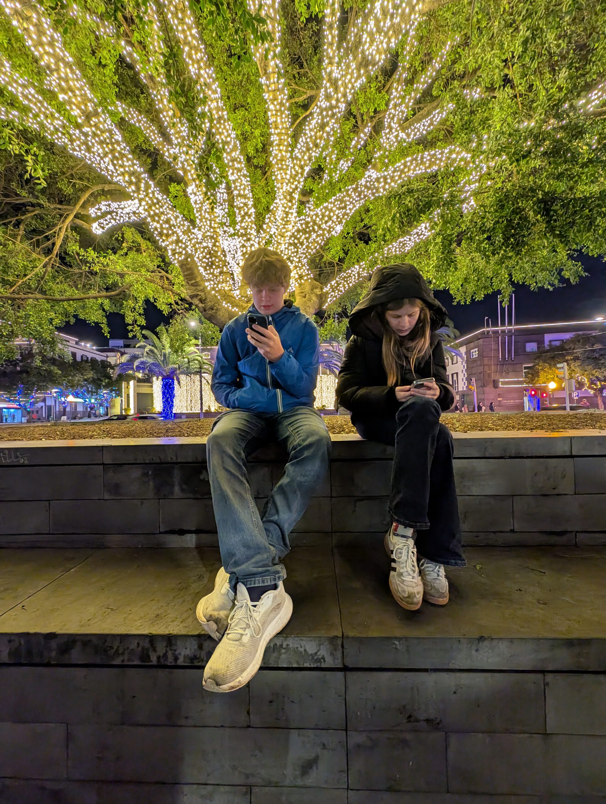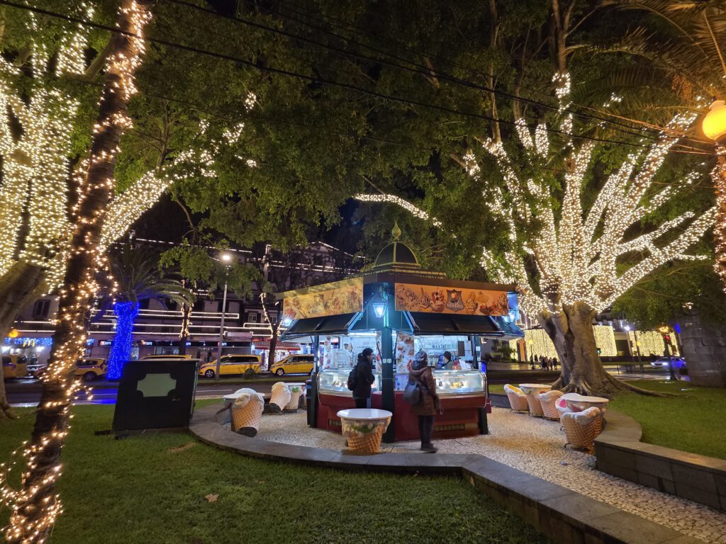 Da es unser letzter Abend in der Stadt ist, ziehen wir vor allem auf Wunsch von Kilian nochmal los. Auf dem steilen Weg bergab bekommen Louisa und Nicole auf einmal Licht aus dem Handy einer jungen Portugiesin – sie sollen doch bitte gut aufpassen, es ist rutschig. Als man ihr den Weg frei machen will, lacht sie nur – sie sei das doch gewohnt! Und ist schnell in der Dunkelheit verschwunden. Wir schlendern durch den Weihnachtsmarkt, nochmal zum großen blinkenden Christbaum am Kai. Dort ist inzwischen die Bühne abgebaut, auch die Maroniverkäufer fehlen. Die Jungs entscheiden, dass wir Richtung Hotelzone laufen, dort waren wir noch nicht. Also ein paar Kilometer am Meer entlang, Fotostopp beim Inselheiligen Cristiano Ronaldo. Dann einen steilen Berg hoch an teuren Hotels vorbei, doch nicht in eines der Restaurants direkt vor Ort, aber in einen kleinen Italiener. Unverwüstlicher Italopop dröhnt aus den Lautsprechern und es gibt Salat!!!! Grünzeug! Plus Pizza und Nudeln und Tiramisu. Ein schöner Abschluss. Als wir den Berg zu uns hochlaufen fängt es wieder an zu tröpfeln. Immerhin 16.000 Schritte, gut 13 Kilometer.