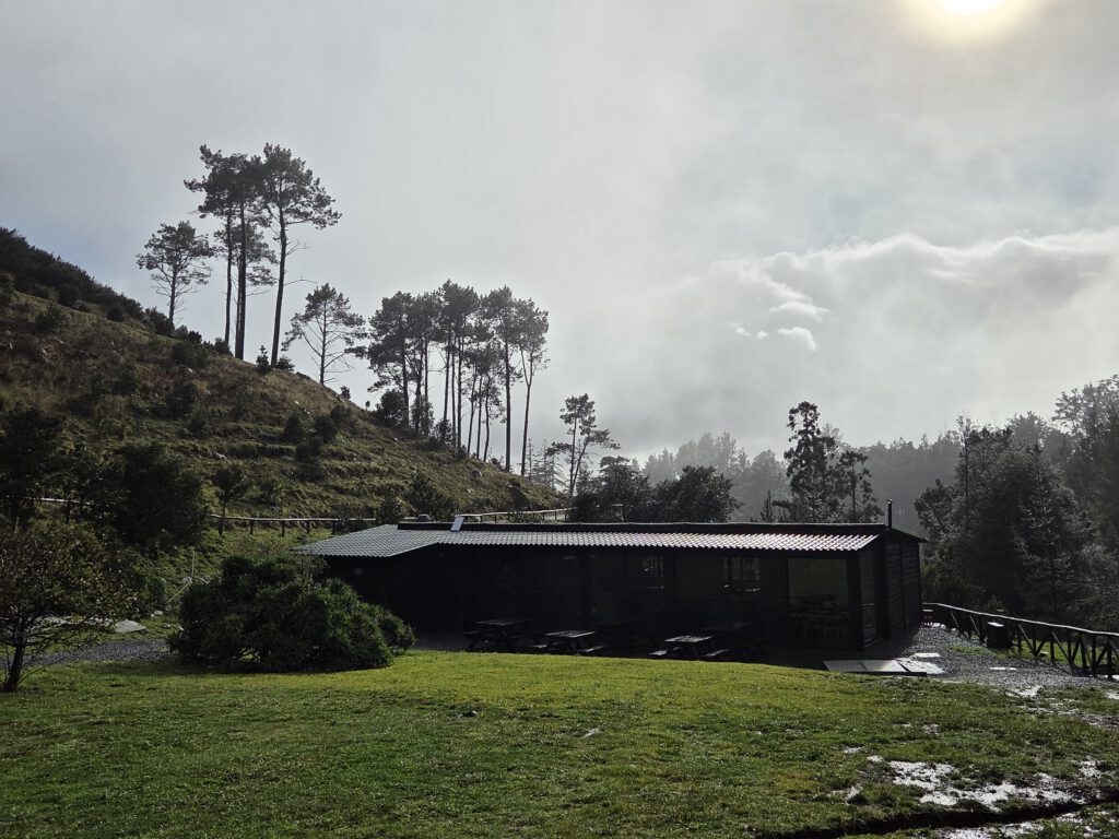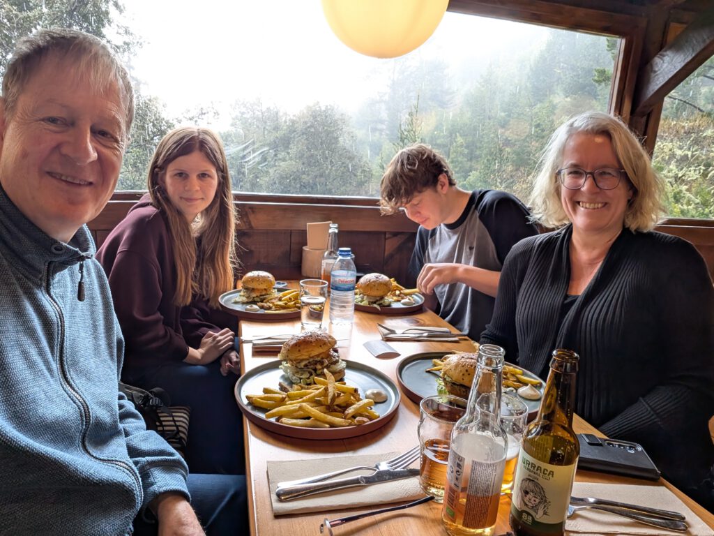Was nun? Mit dem Mietwagen in den Innenstadt muss nicht sein. Gerald würde gerne einen Berg hoch, Nicole erinnert sich, dass ihr mal das „Forest Café“ vorgeschlagen wurde, das liegt noch oberhalb vom Stadtteilt Monte. Viele Regenbogen begleiten uns auf dem Weg, jeder wird inzwischen frenetisch gefeiert. Das Navigationssystem Nicole hat wieder Tücken, Kilian nimmt sich vergnügt die Kopfhörer aus dem Ohr, „diese Comedy will ich doch nicht verpassen“. Und es geht steile Wege nach oben, erst war es trocken, dann nieselt es, schließlich Graupel. Wir witzeln schon, ob es da wirklich ein Café gibt – aber tatsächlich. Im strömenden kühlen Regen bei 6 Grad wartet auf uns eine gemütliche Holzhütte mit leckeren Burgern.