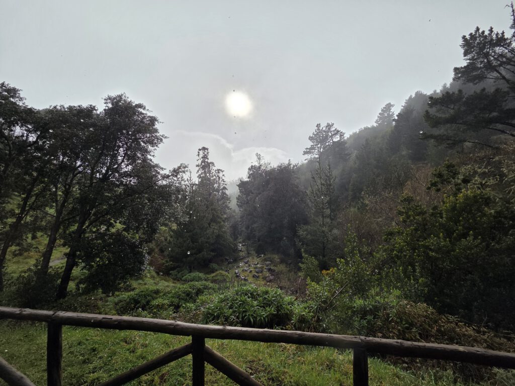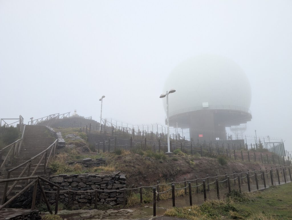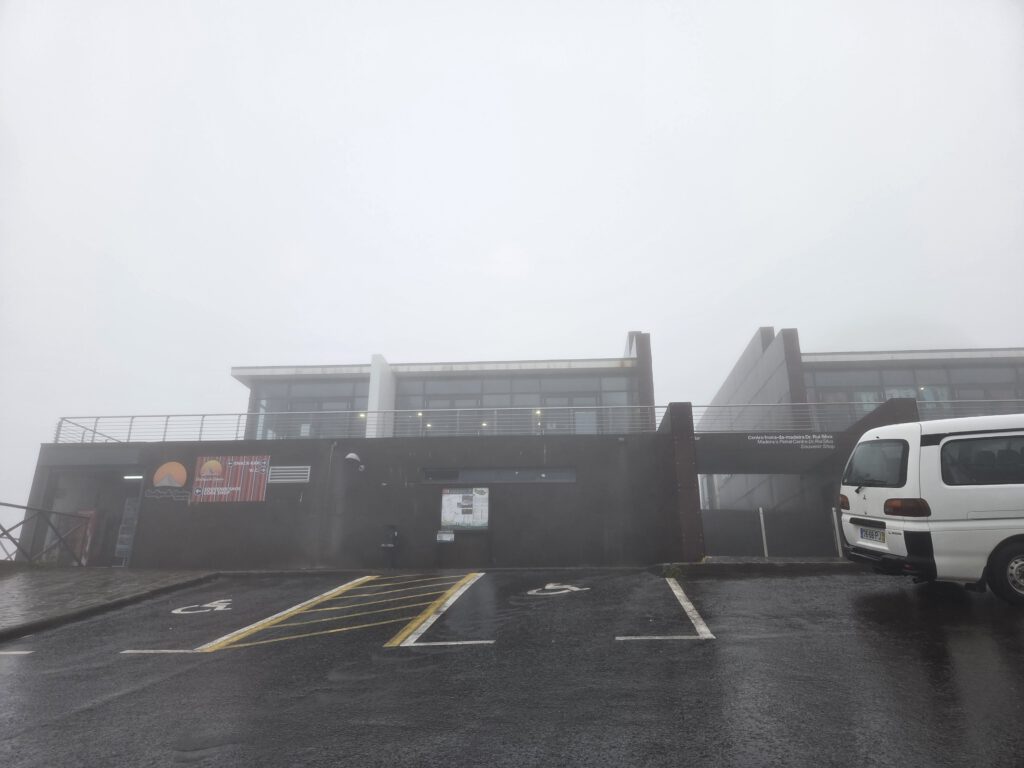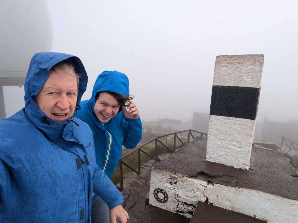 Und wo wir schonmal da sind, würde Gerald gerne wissen, ob der Pico do Arieiro, gut 1800 Meter hoch, eventuell über den Wolken liegt … Wir fahren also nochmal einige gute Kilometer bergauf, durch immer dichteren Nebel und Dunst, das Thermometer zeigt irgendwann nur noch 2 Grad an. Aber, erstaunlich, auf dem Parkplatz unterhalb von Café und Gipfel stehen an die zehn Autos. Gerald und Kilian huschen kurz zum Gipfel und sichten sogar Wanderer. Louisa und Nicole ziehen das warme Auto vor … Auf dem Weg nach unten reißt der Himmel wieder auf.