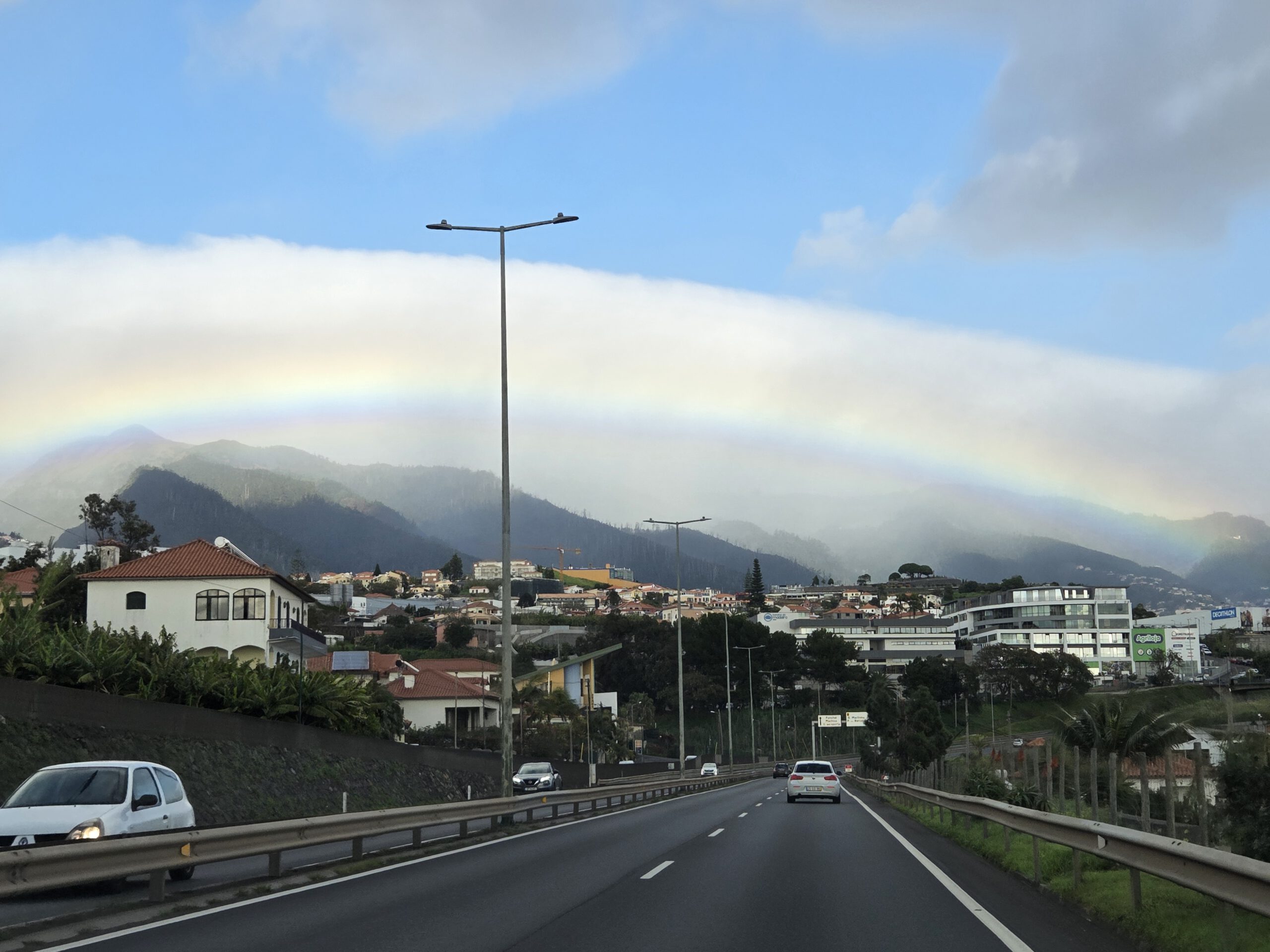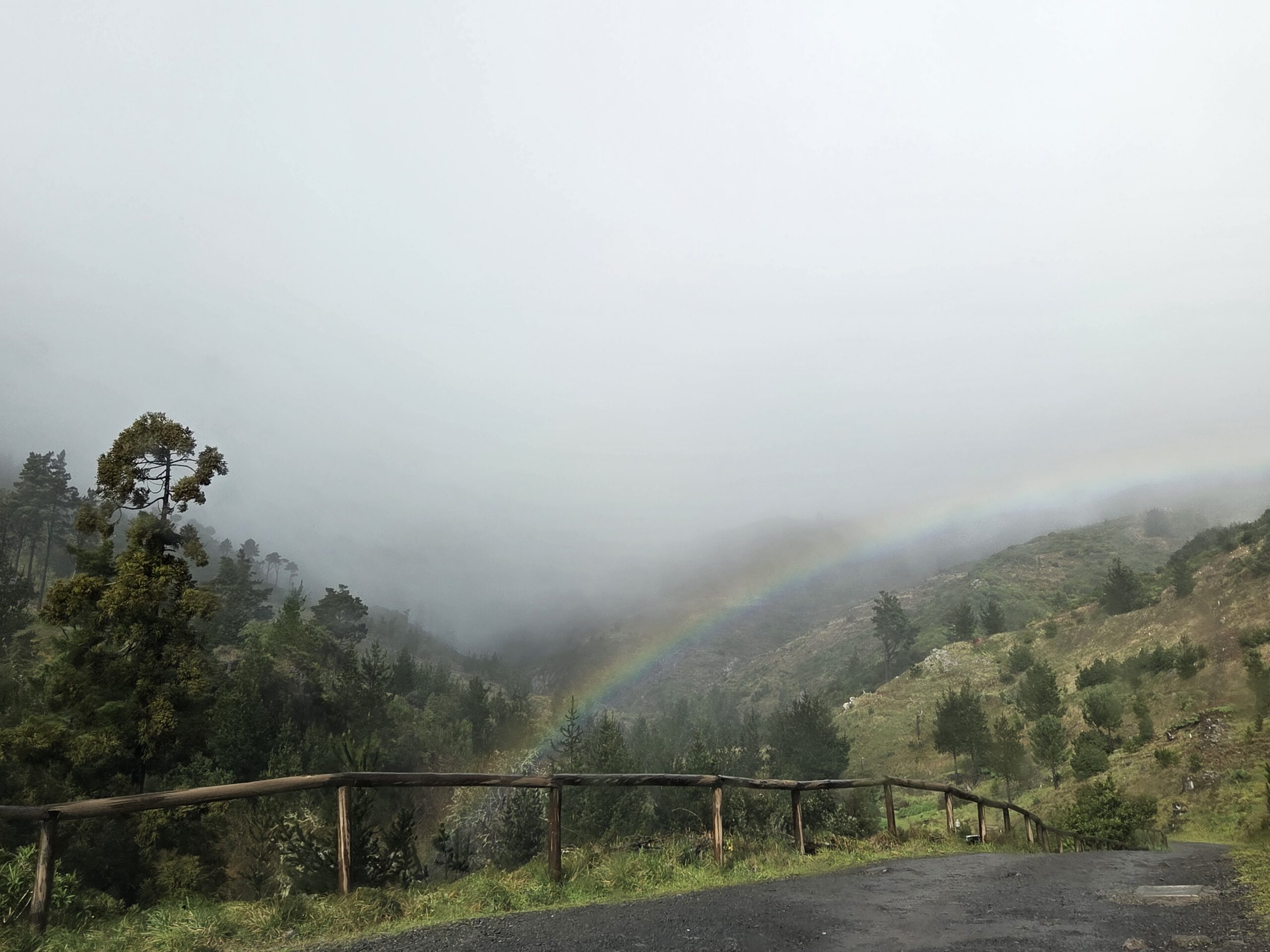 Was nun? Mit dem Mietwagen in den Innenstadt muss nicht sein. Gerald würde gerne einen Berg hoch, Nicole erinnert sich, dass ihr mal das „Forest Café“ vorgeschlagen wurde, das liegt noch oberhalb vom Stadtteilt Monte. Viele Regenbogen begleiten uns auf dem Weg, jeder wird inzwischen frenetisch gefeiert. Das Navigationssystem Nicole hat wieder Tücken, Kilian nimmt sich vergnügt die Kopfhörer aus dem Ohr, „diese Comedy will ich doch nicht verpassen“. Und es geht steile Wege nach oben, erst war es trocken, dann nieselt es, schließlich Graupel. Wir witzeln schon, ob es da wirklich ein Café gibt – aber tatsächlich. Im strömenden kühlen Regen bei 6 Grad wartet auf uns eine gemütliche Holzhütte mit leckeren Burgern.