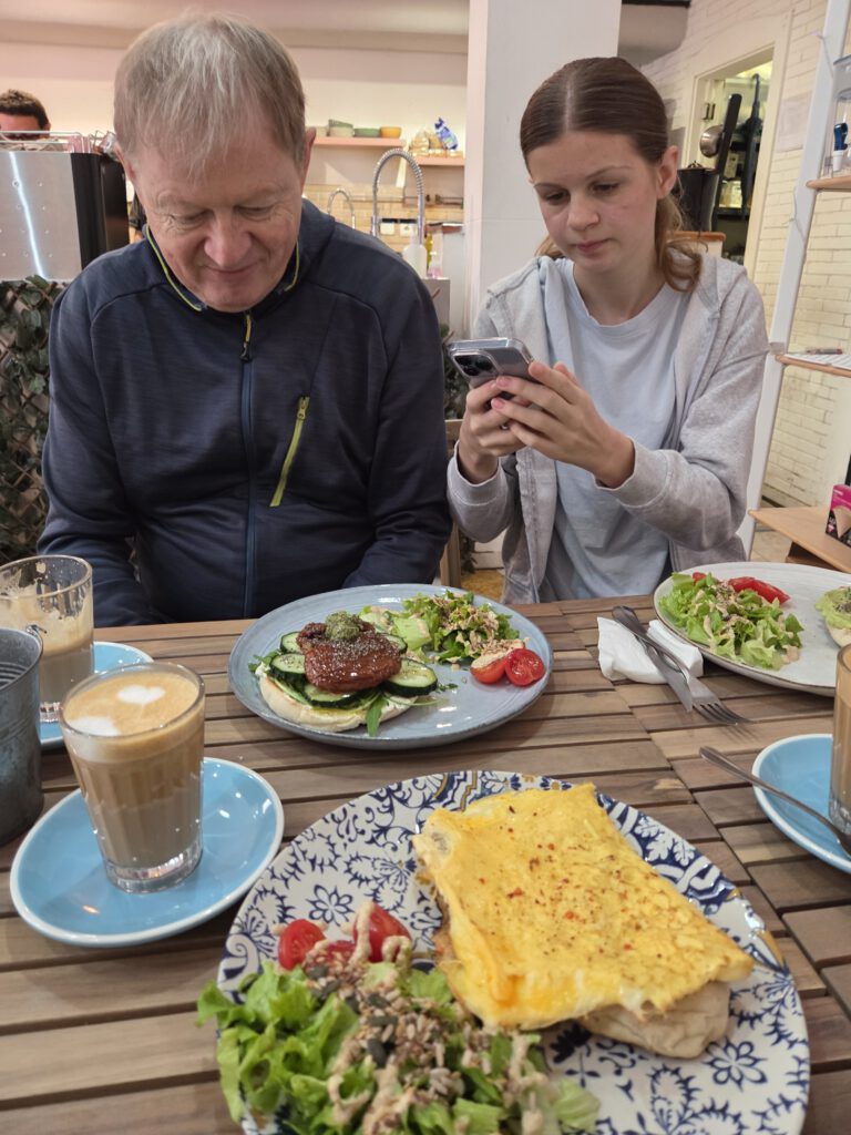 Als wir aufwachen strahlt die Sonne und es fühlt sich nach Frühling an. Bis wir die Aussicht bewundert und geduscht haben, wieder in die Innenstadt gelaufen sind …. Ist es gut 10.30 Uhr. Wir stellen fest: Viele Menschen. Also viel zu viele Menschen, die vermutlich größtenteils auf den Kreuzfahrtschiffen übernachtet haben und jetzt die Stadt fluten. Die Cafés sind knallvoll, aber wir finden schließlich im The Studio noch ein Plätzchen. Sogar eine Mini-Krippe gibt es. Zwar dauert es ein bisschen, bis wir unseren Kaffee und die belegten Kichererbsenmehlfladen bekommen, aber es gibt auch viel zu sehen. Sieht man uns genauso an, dass wir Deutsche sind, wie die US-Amerikaner ein Leuchtschild über den Kopf zu tragen scheinen…?