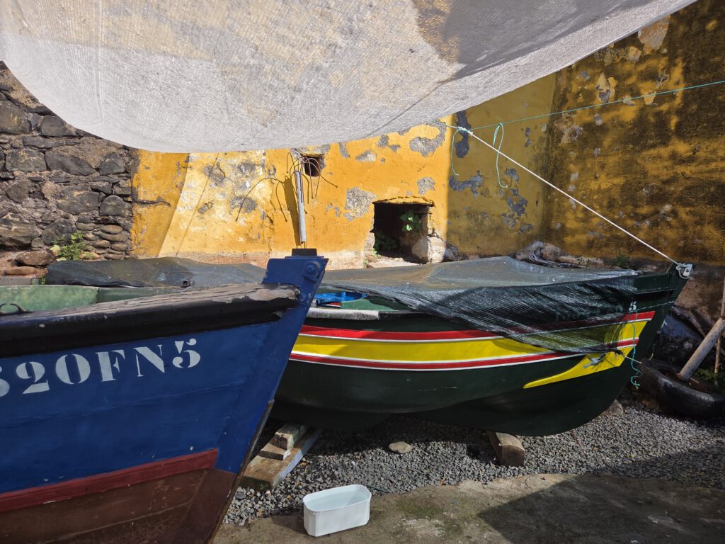 Die Sonne strahlt vom Himmel, wobei uns die Temperaturen von über 20 Grad etwas überfordern, ebenso wie die komplett überfüllten Gassen. Wir laufen am Meer entlang zum Forte de Sao Tiago, hier sonnen sich die Portugiesen auf den Steinen oder gehen direkt schwimmen. Zurück im Palmenschatten holen wir schnell Getränke aus einem kleinen Spar, neben uns spielen Senioren Karten. Am noch geschlossenen Jahrmarkt vorbei ab nach Hause – irgendwie steckt uns die Grippe doch noch in den Knochen.