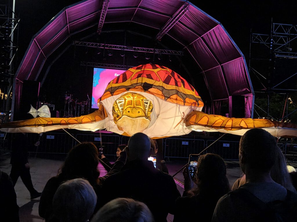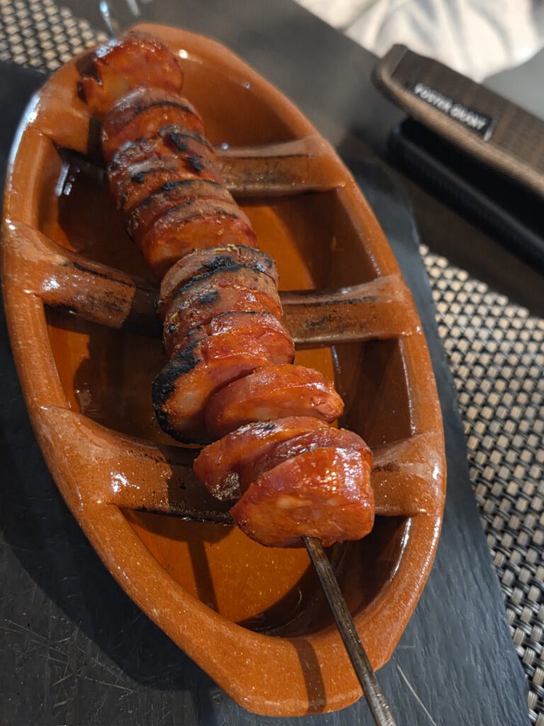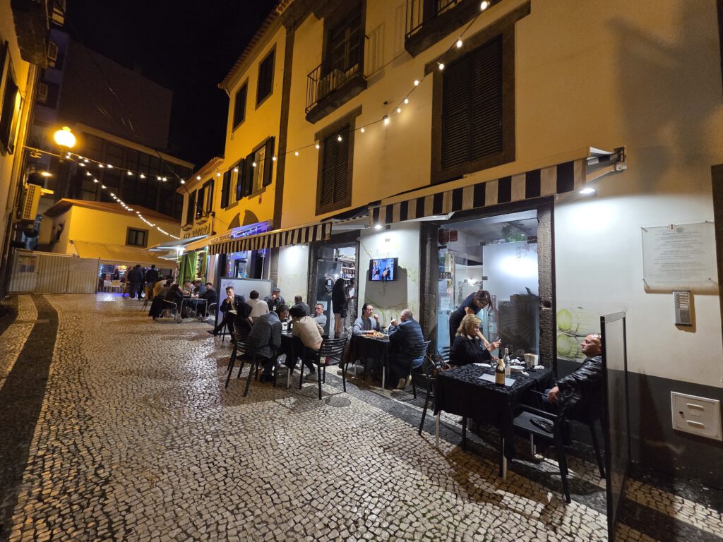 Nach einer ausgedehnten Pause ziehen wir wieder los, erstmal in einen großen Supermarkt, Frühstück für die nächsten zwei Tage kaufen. Der Wetterbericht verspricht leider wieder warmen Regen und davon viel. Rechtzeitig zum Sonnenuntergang und einer wunderschönen Abendstimmung sind wir bei den Kreuzfahrtschiffen, von denen zwei wieder ablegen. Danach suchen wir wieder nach einer kleinen Einkehr – und werden erneut fündig! Kilian findet eine Gasse mit mehreren kleinen Restaurants und Bars, im Regioes House, einer Wine Bar, gibt es nicht nur guten Wein, sondern auch feine Tapas, wenn auch eher auf der Fleisch-Käse-Seite (das werden zwei gemüsefreie Wochen, wie es scheint…). Und es gibt viel zu sehen, das offensichtlich ein Profifotograf die Chefin bei der Zubereitung der Speisen ablichtet und irgendwann sogar ihr Mann dazu kommt, um beim Spülen zu helfen.