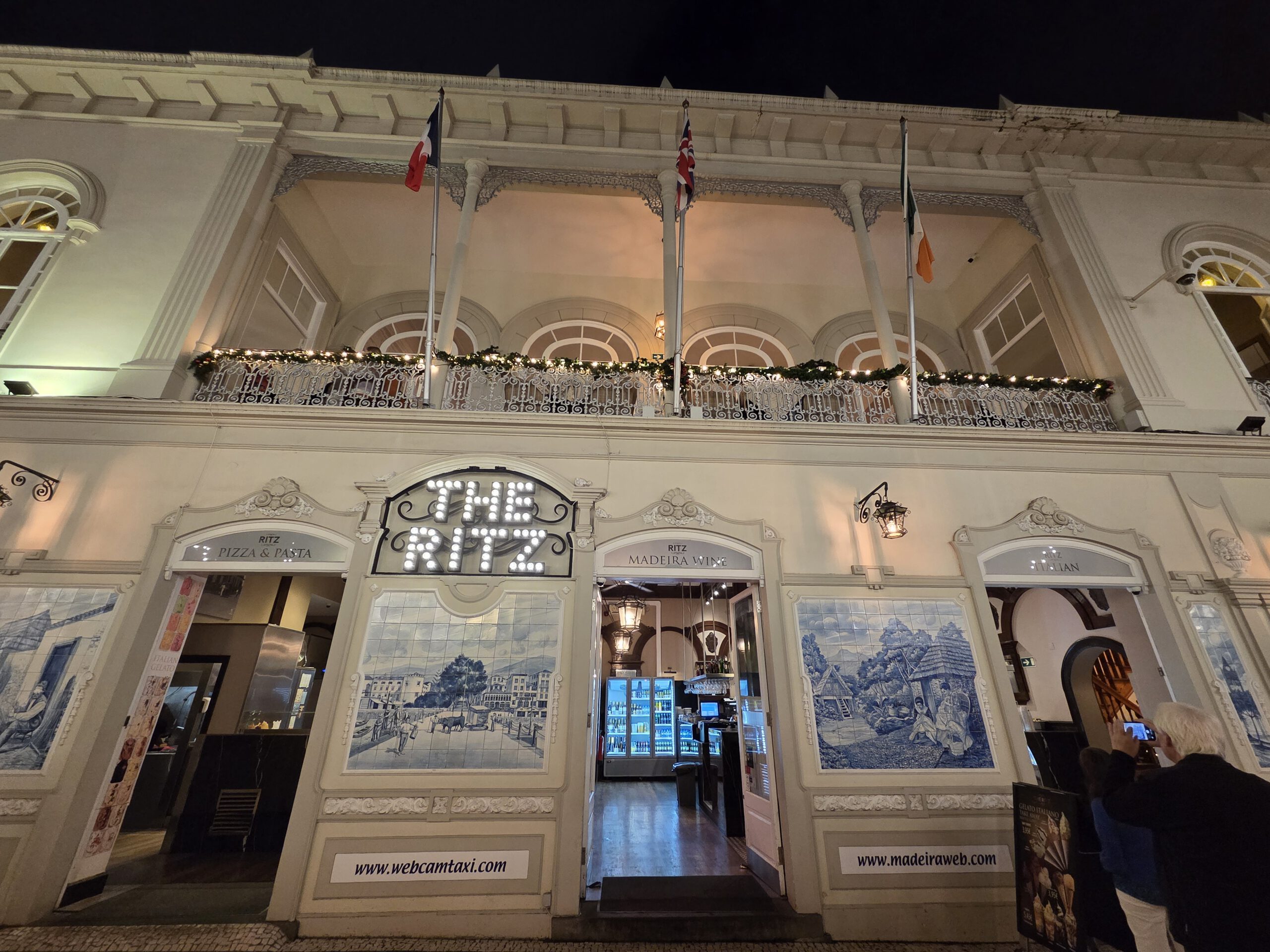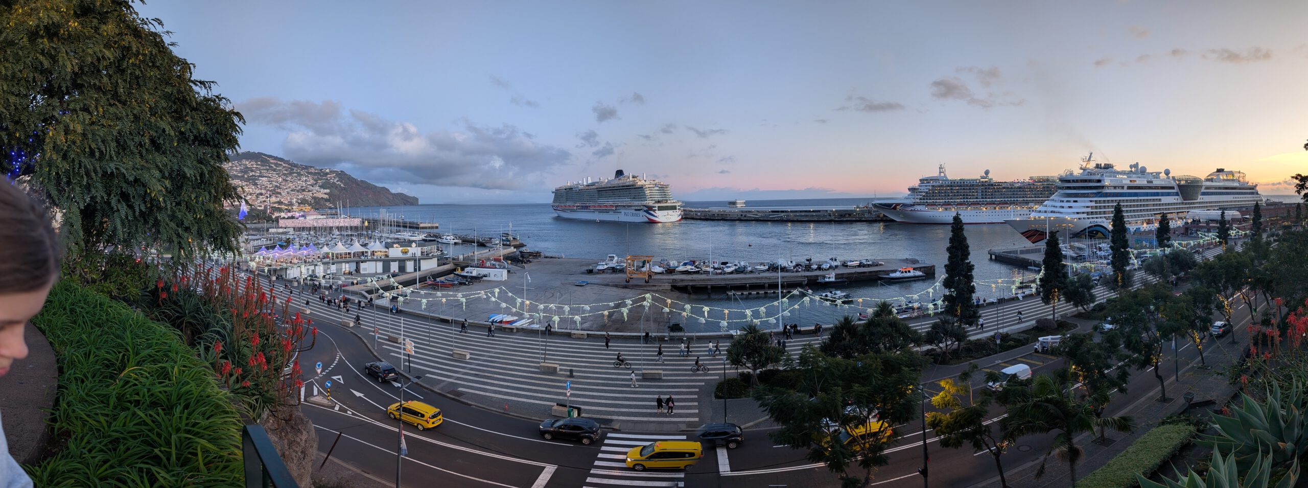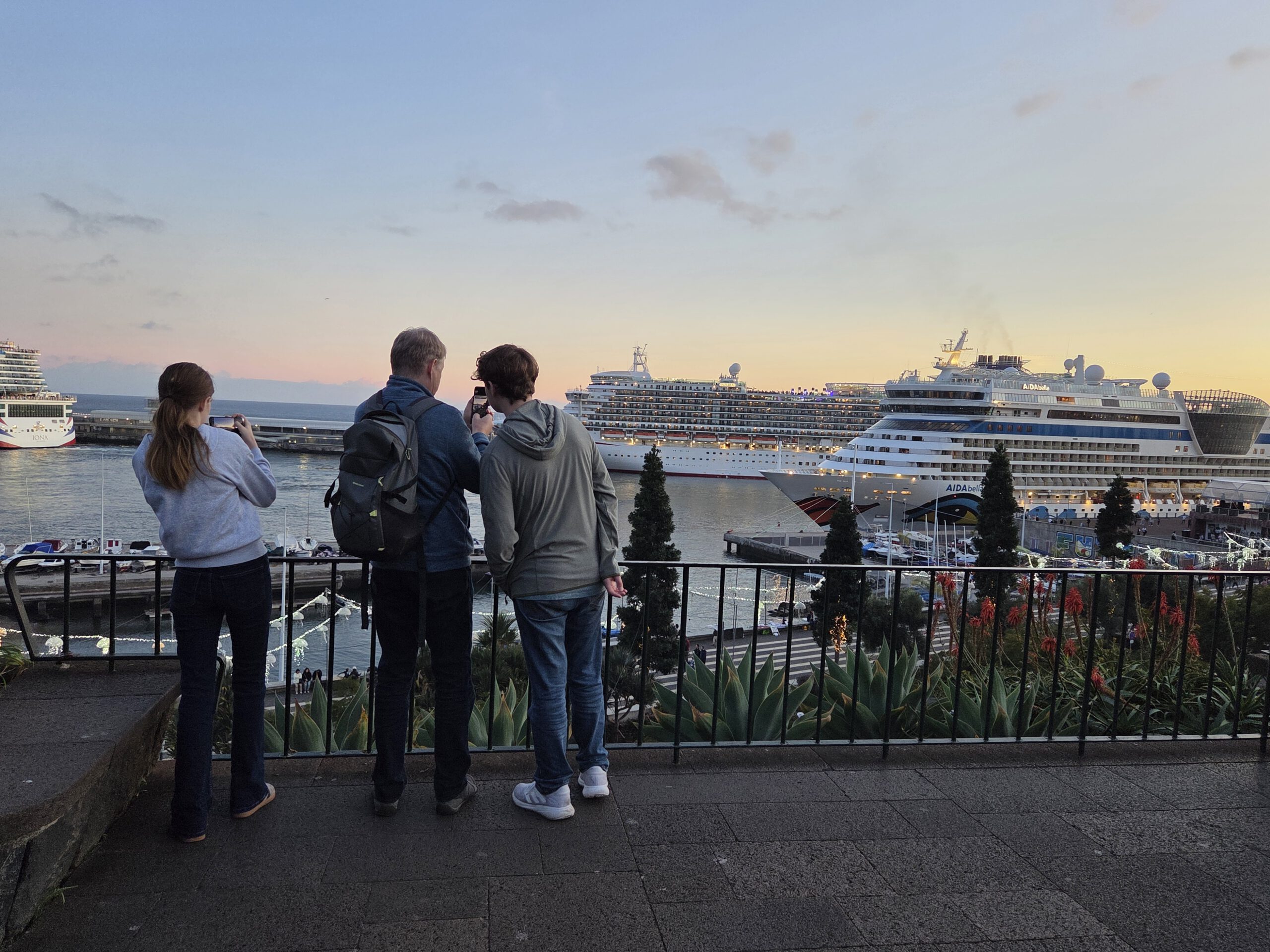 Nach einer ausgedehnten Pause ziehen wir wieder los, erstmal in einen großen Supermarkt, Frühstück für die nächsten zwei Tage kaufen. Der Wetterbericht verspricht leider wieder warmen Regen und davon viel. Rechtzeitig zum Sonnenuntergang und einer wunderschönen Abendstimmung sind wir bei den Kreuzfahrtschiffen, von denen zwei wieder ablegen. Danach suchen wir wieder nach einer kleinen Einkehr – und werden erneut fündig! Kilian findet eine Gasse mit mehreren kleinen Restaurants und Bars, im Regioes House, einer Wine Bar, gibt es nicht nur guten Wein, sondern auch feine Tapas, wenn auch eher auf der Fleisch-Käse-Seite (das werden zwei gemüsefreie Wochen, wie es scheint…). Und es gibt viel zu sehen, das offensichtlich ein Profifotograf die Chefin bei der Zubereitung der Speisen ablichtet und irgendwann sogar ihr Mann dazu kommt, um beim Spülen zu helfen.