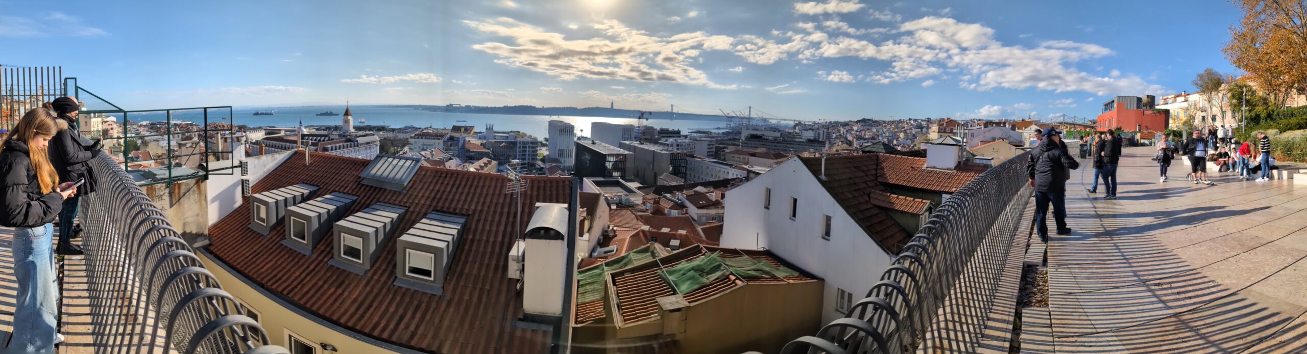 Die Fahrt nach oben ist urig und kurz. Menschen filmen drinnen und draußen, laufen über die Gleise vor und hinter der Bahn, die tatsächlich aber nur kurz hupt, als ein Polizeiauto den Verkehr blockiert. Der Verdacht liegt nahe, dass das Bähnchen inzwischen eine Instagram Karriere aufgebaut hat. Wieder staunen wir über die klitzekleinen Läden, Mercados, auf ein paar Quadratmetern Fläche und Bars, die kaum größer sind. Wir erklimmen mit dem Miradouro da San Catherina den ersten Aussichtspunkt und genießen die Sonne.