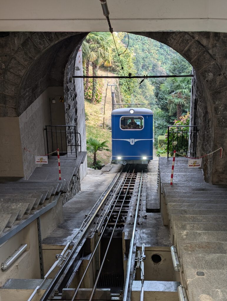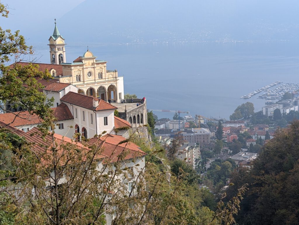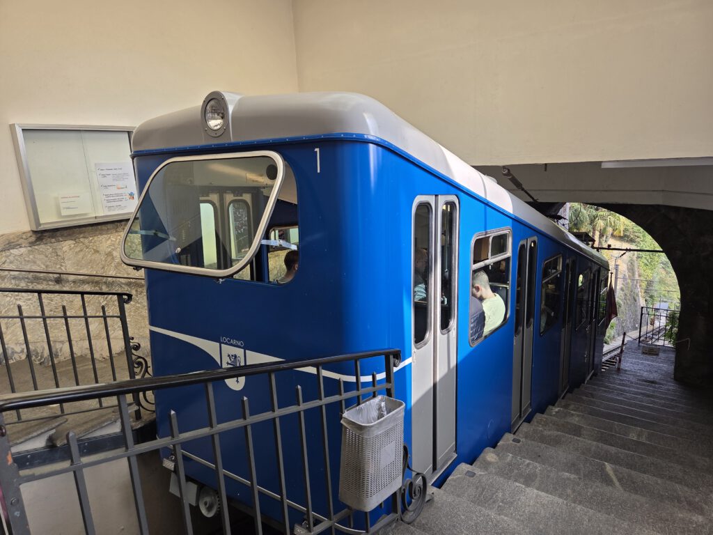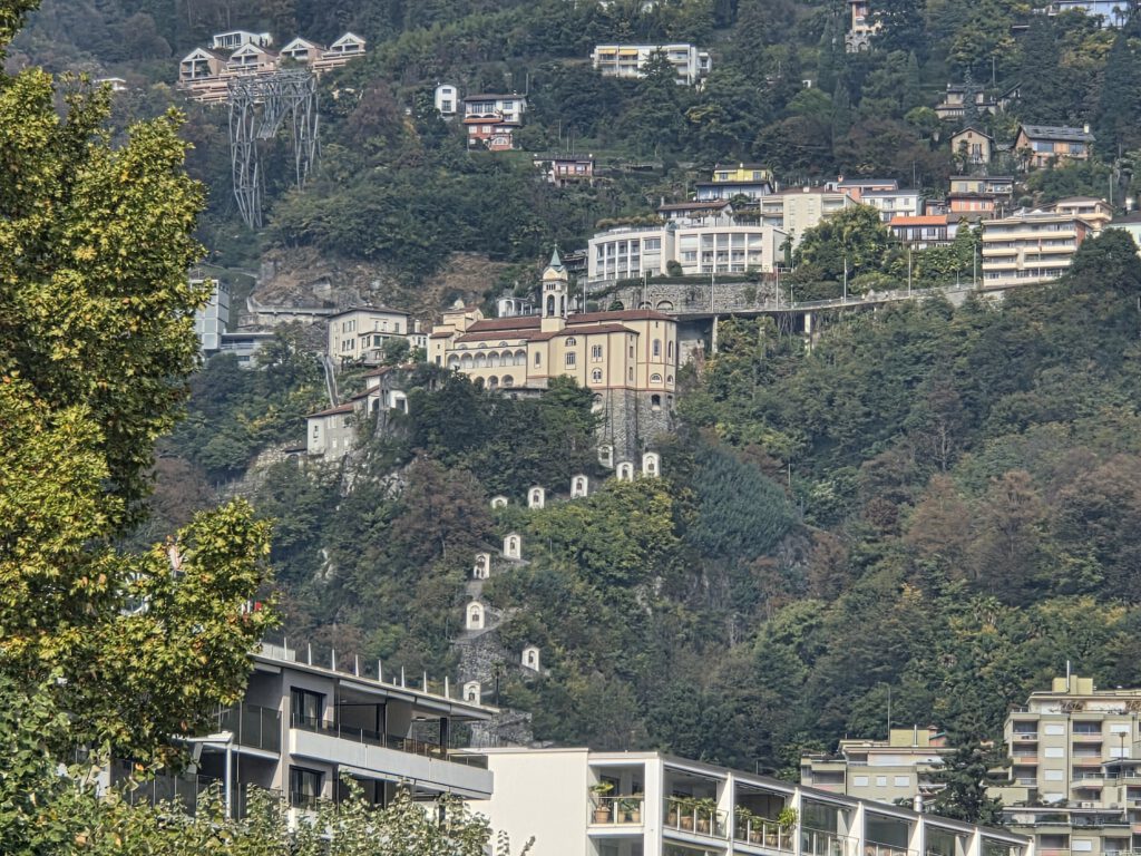 Picknickort wird der Bootsableger, danach gehen wir zu Fuß über den Kreuzweg hoch zur Wallfahrtskirche Madonna del Sasso. Diese liegt attraktiv auf einem Hügel und ist unter anderem über den Kreuzweg zu Fuß zu erreichen. Aber es ist dann doch gar nicht so steil, wie es zunächst wirkt. Die Sicht ist wunderschön und es ist gar nicht so viel los. Das Innere der 1480 begonnenen Kapelle ist rettungslos überladen und leider fehlen die Büchlein mit den Geschichten derer, die sich für die Heilung bedanken, was es anderswo immer gibt. Für den Rückweg wollen wir die kleine blaue Standseilbahn nehmen, die uns sehr an Lissabon erinnert. Aber … Nur Barzahlung in Schweizer Franken.