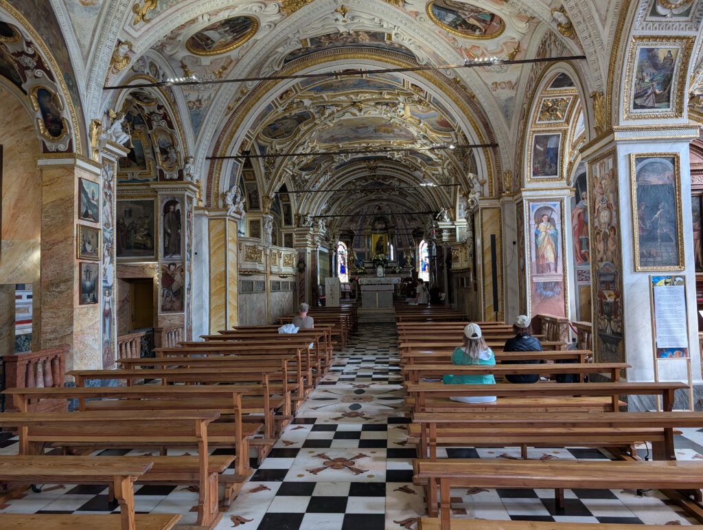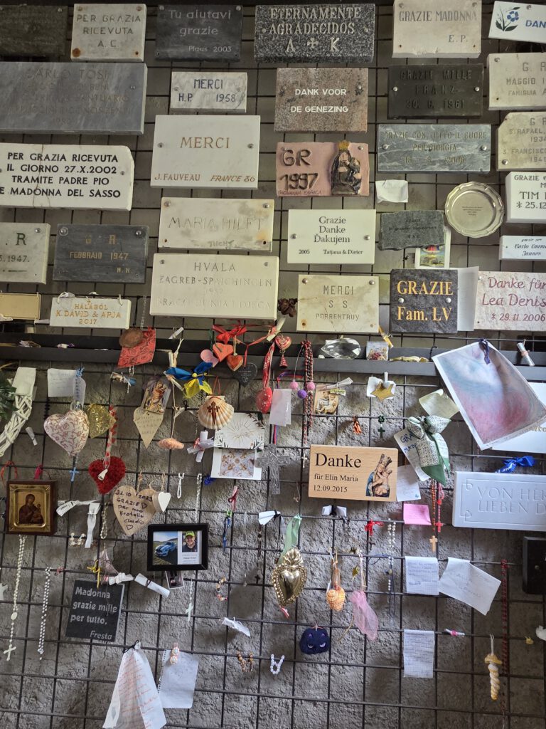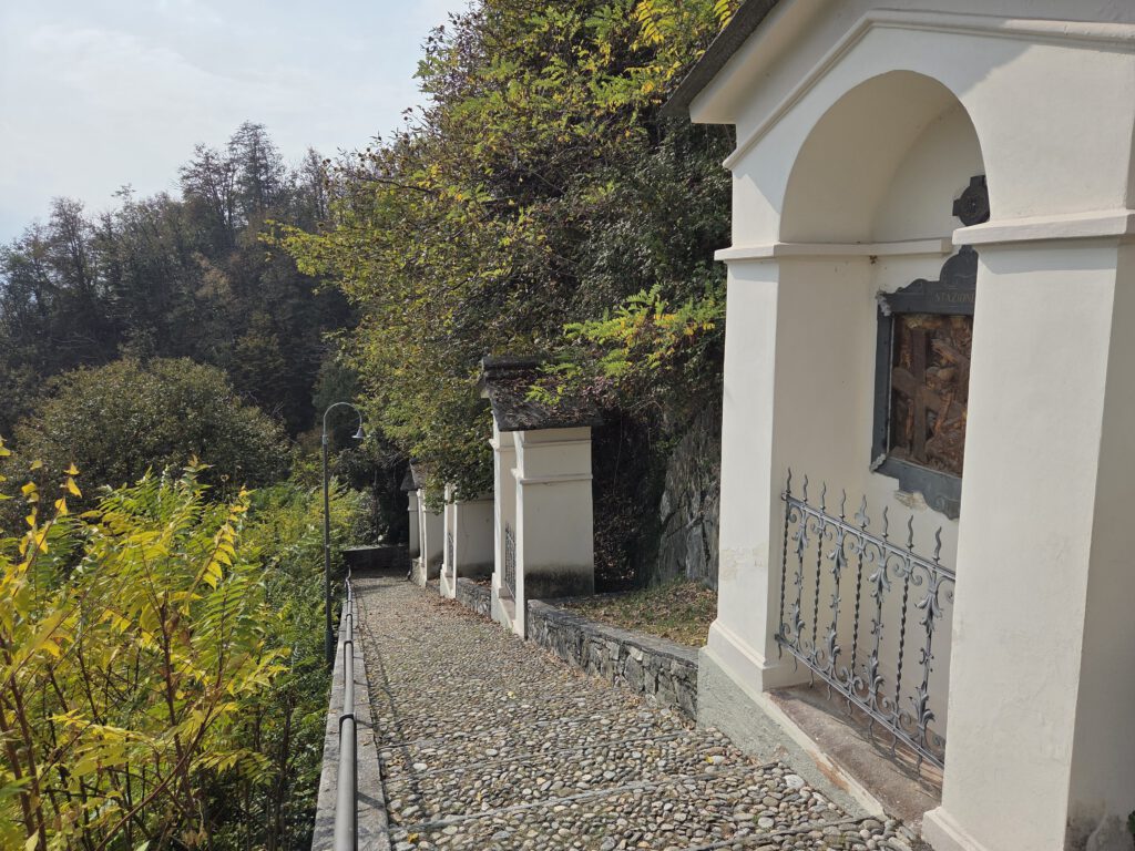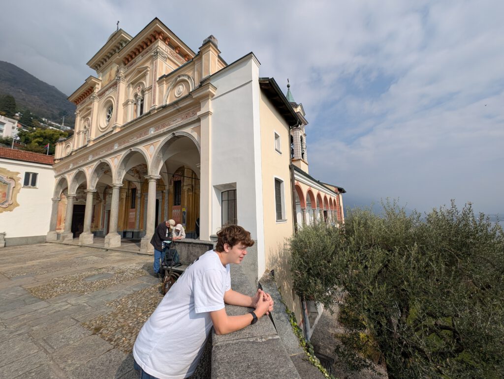 Picknickort wird der Bootsableger, danach gehen wir zu Fuß über den Kreuzweg hoch zur Wallfahrtskirche Madonna del Sasso. Diese liegt attraktiv auf einem Hügel und ist unter anderem über den Kreuzweg zu Fuß zu erreichen. Aber es ist dann doch gar nicht so steil, wie es zunächst wirkt. Die Sicht ist wunderschön und es ist gar nicht so viel los. Das Innere der 1480 begonnenen Kapelle ist rettungslos überladen und leider fehlen die Büchlein mit den Geschichten derer, die sich für die Heilung bedanken, was es anderswo immer gibt. Für den Rückweg wollen wir die kleine blaue Standseilbahn nehmen, die uns sehr an Lissabon erinnert. Aber … Nur Barzahlung in Schweizer Franken.