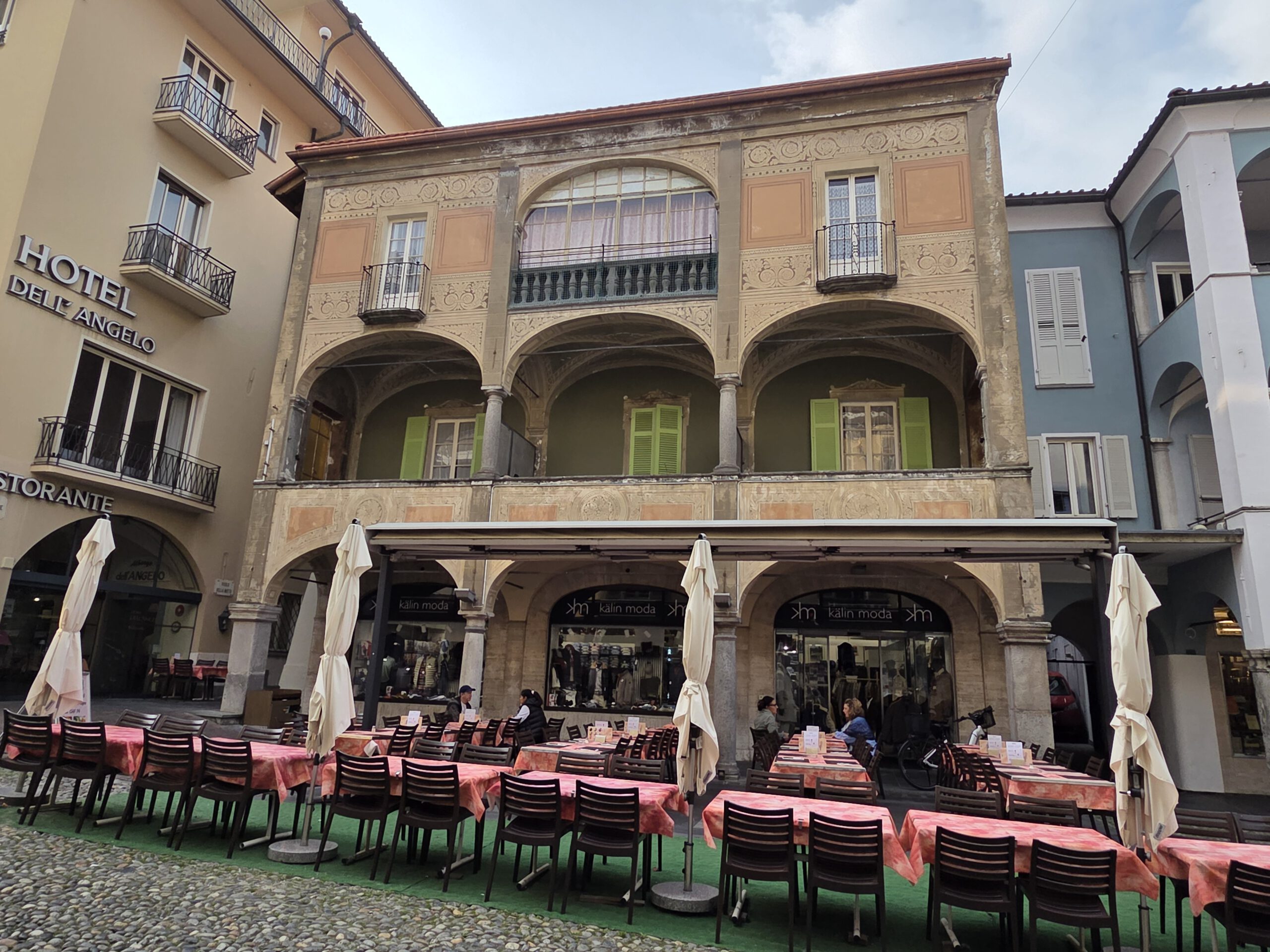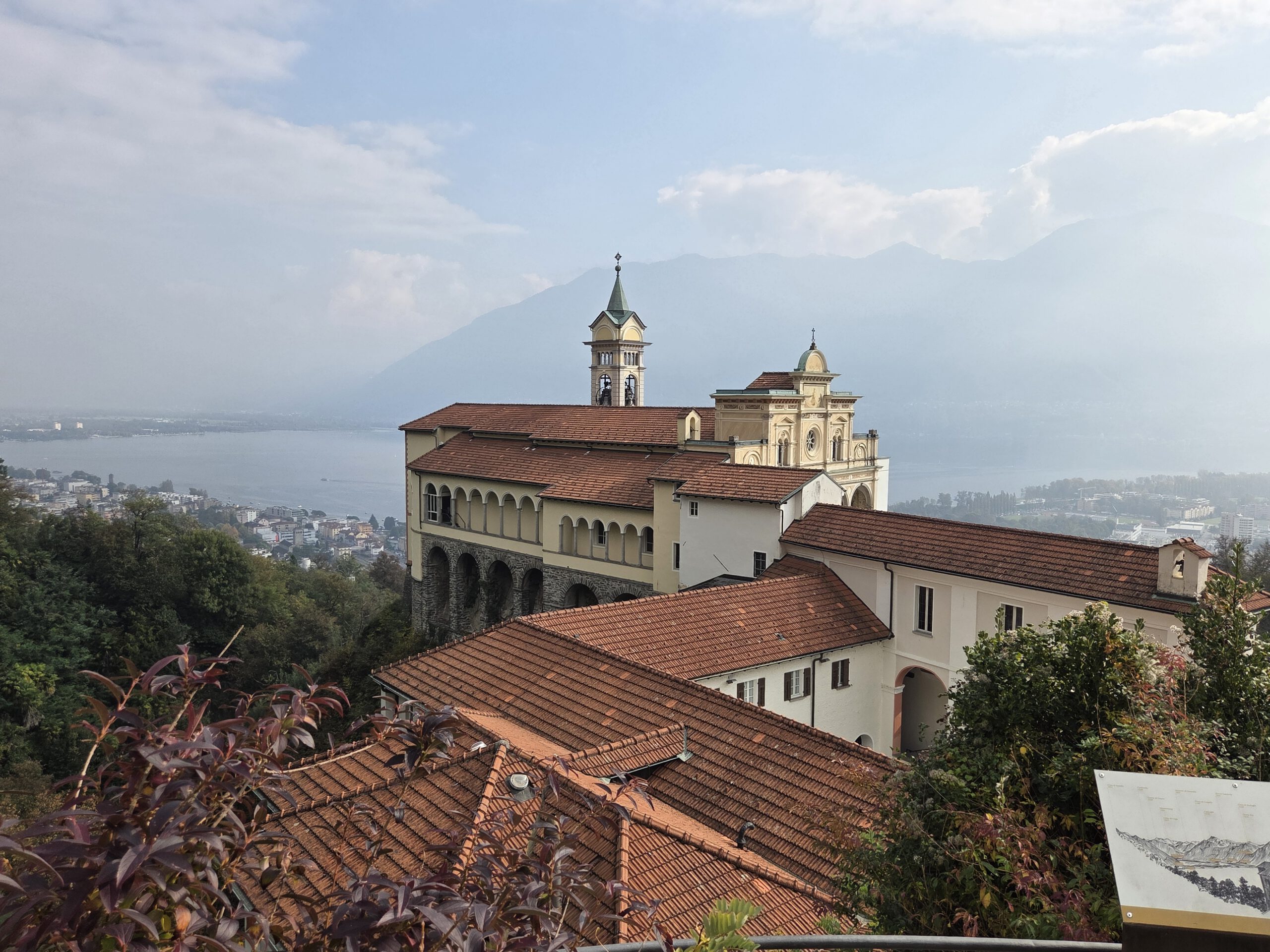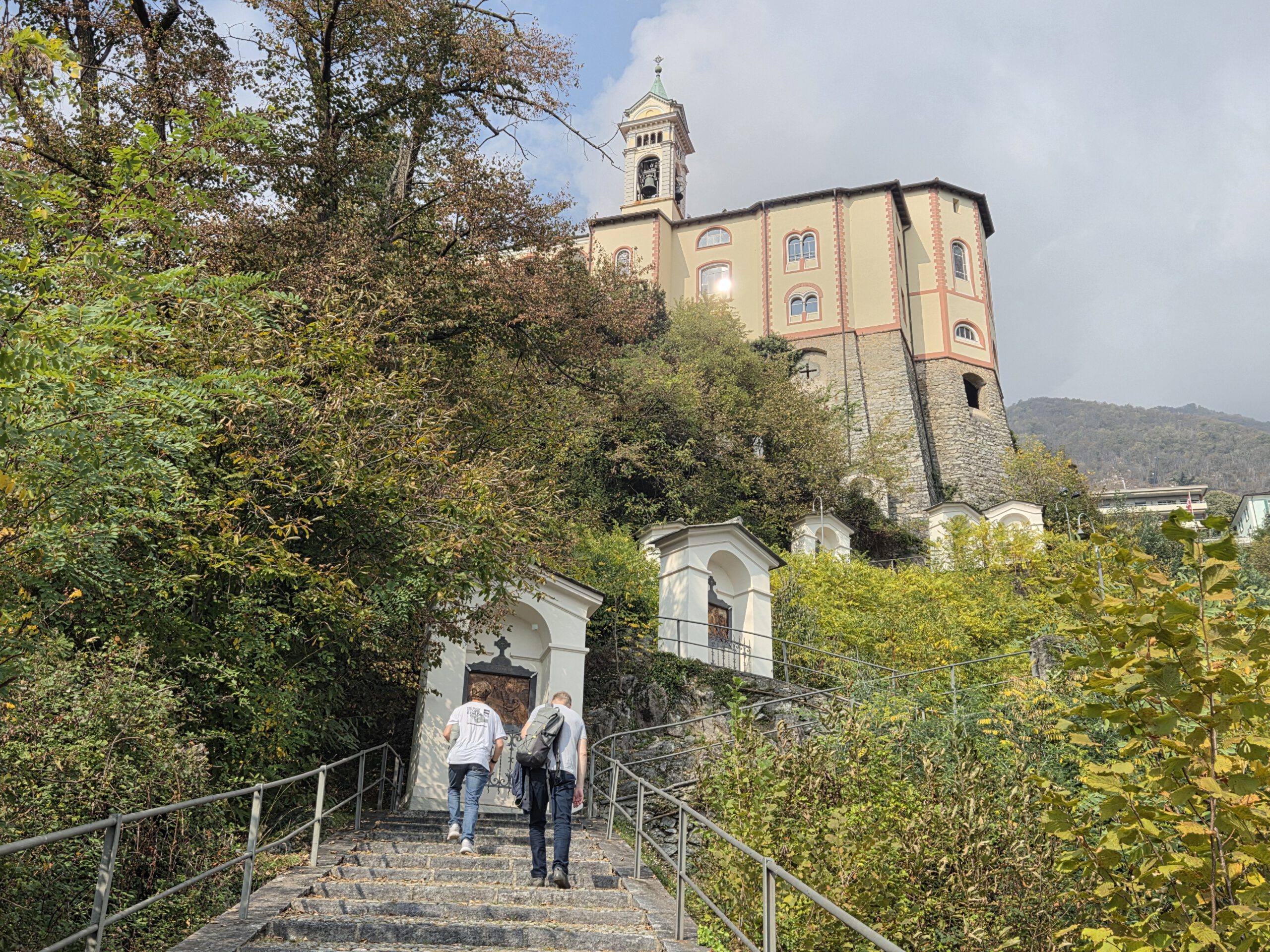 Picknickort wird der Bootsableger, danach gehen wir zu Fuß über den Kreuzweg hoch zur Wallfahrtskirche Madonna del Sasso. Diese liegt attraktiv auf einem Hügel und ist unter anderem über den Kreuzweg zu Fuß zu erreichen. Aber es ist dann doch gar nicht so steil, wie es zunächst wirkt. Die Sicht ist wunderschön und es ist gar nicht so viel los. Das Innere der 1480 begonnenen Kapelle ist rettungslos überladen und leider fehlen die Büchlein mit den Geschichten derer, die sich für die Heilung bedanken, was es anderswo immer gibt. Für den Rückweg wollen wir die kleine blaue Standseilbahn nehmen, die uns sehr an Lissabon erinnert. Aber … Nur Barzahlung in Schweizer Franken.