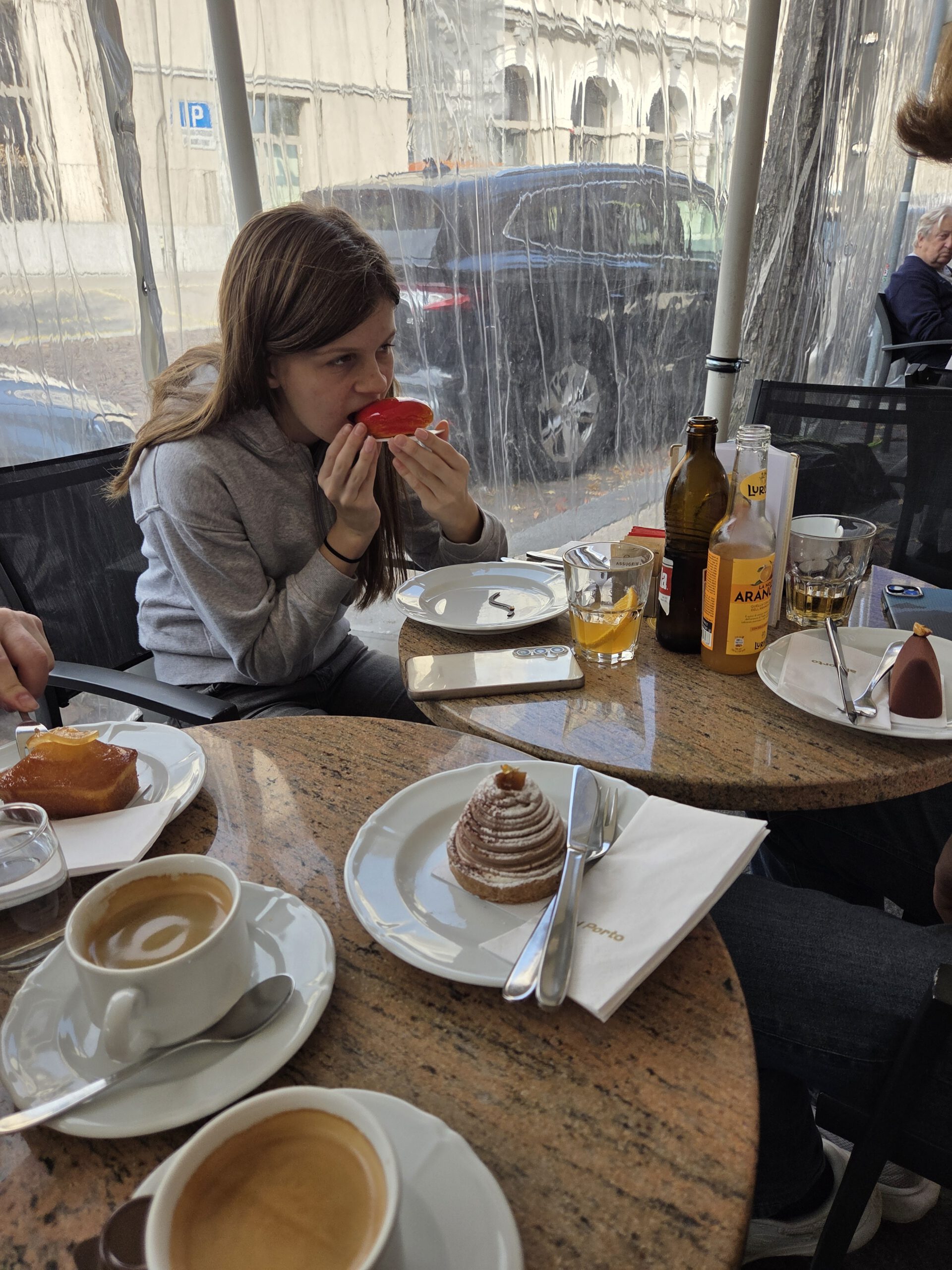 Also laufen wir den Pilgerweg auch wieder nach unten und belohnen uns danach noch mit vier Teilchen im Café Al Porto, die allesamt sehr fein schmecken: Eine Mangokreation für Louisa, Zitronenkuchen für Gerald, Nougathappen für Kilian und Maronencreme für Nicole. Danach buchen wir unsere Tickets für eine ganz besondere Zugfahrt morgen, für die sich die Reiseleitung noch ein ambitioniertes Zusatzprogramm ausgedacht hat – mehr sei noch nicht verraten. Außer: Die Dame am Fahrkartenschalter war beeindruckt.