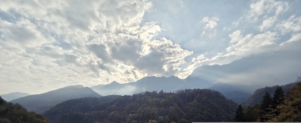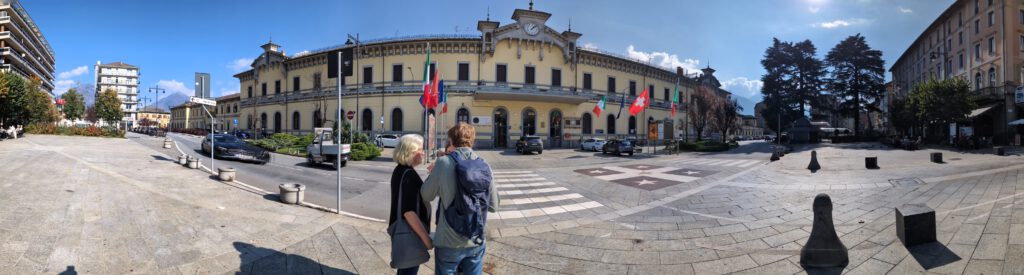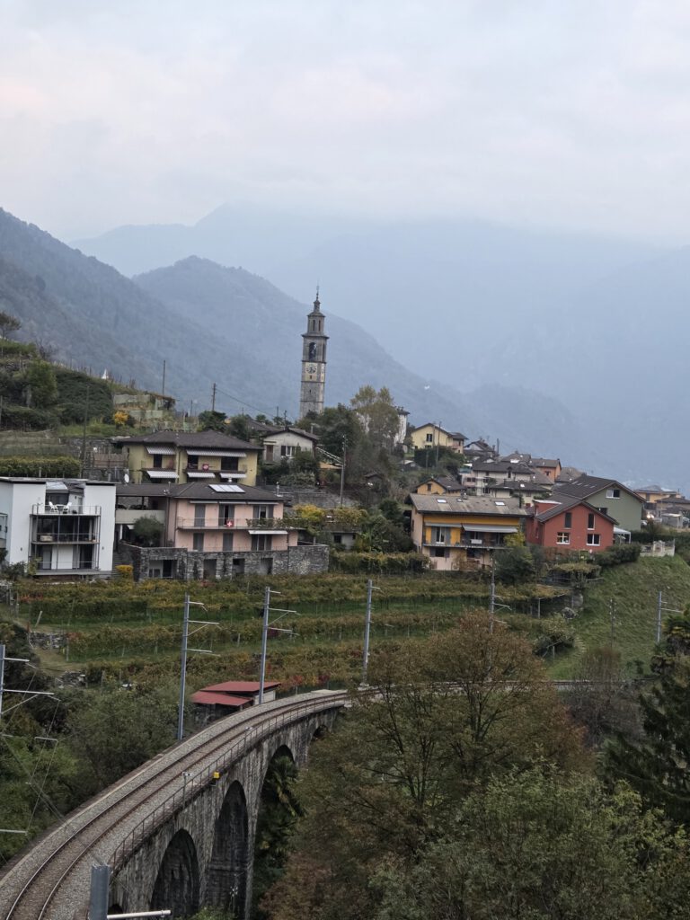 … Am Mittwochabend wissen wir, warum die Frau am Ticket-Schalter so beeindruckt war. Zuvor hatte der Tag vergleichweise früh begonnen, schon um kurz nach 9 Uhr sind wir unterwegs zum Bahnhof. Dort startet um 9.51 Uhr unsere Fahrt mit der Centovalli-Bahn, die Locarno und das italienische Domodossola verbindet. Innerhalb von zwei Stunden gibt es 83 Brücken und 31 Tunnel, die Strecke gilt als eine der schönste der Welt. Der Stadtbahnhof ist inzwischen unterirdisch und im Vergleich zur 102 Jahre alten Zuglinie eher futuristisch. Die Hinfahrt verbringen wir auf unseren reservierten Plätzen in einem der ganz alten Züge, der viel Flair, aber auch viel Lärm zu bieten hat. Sehr entschleunigt, viel Herbstlaub, Wasserfall, Flussausblick, Bauarbeiter usw. Es wird nicht langweilig.