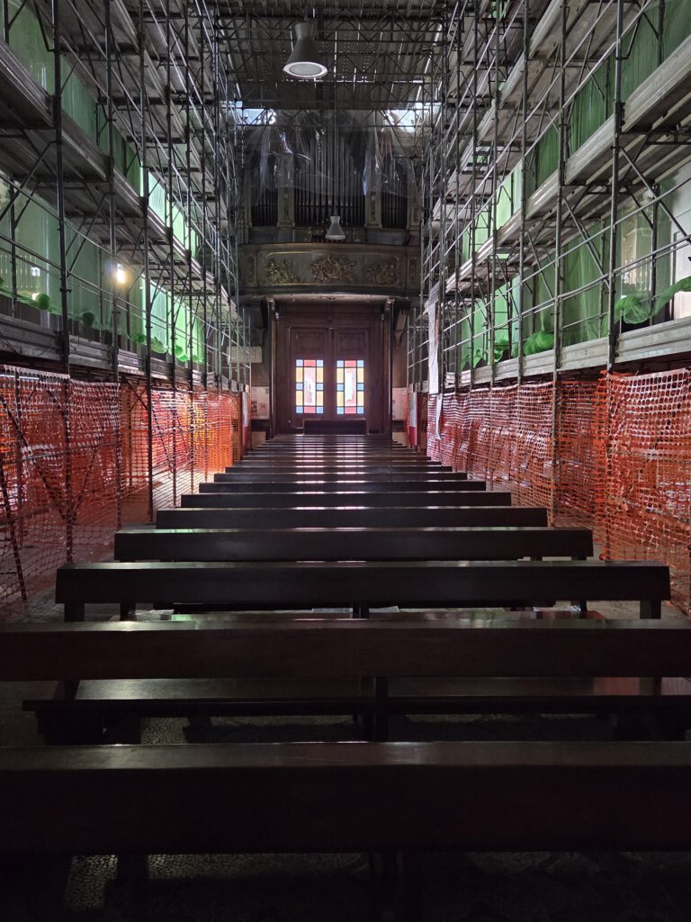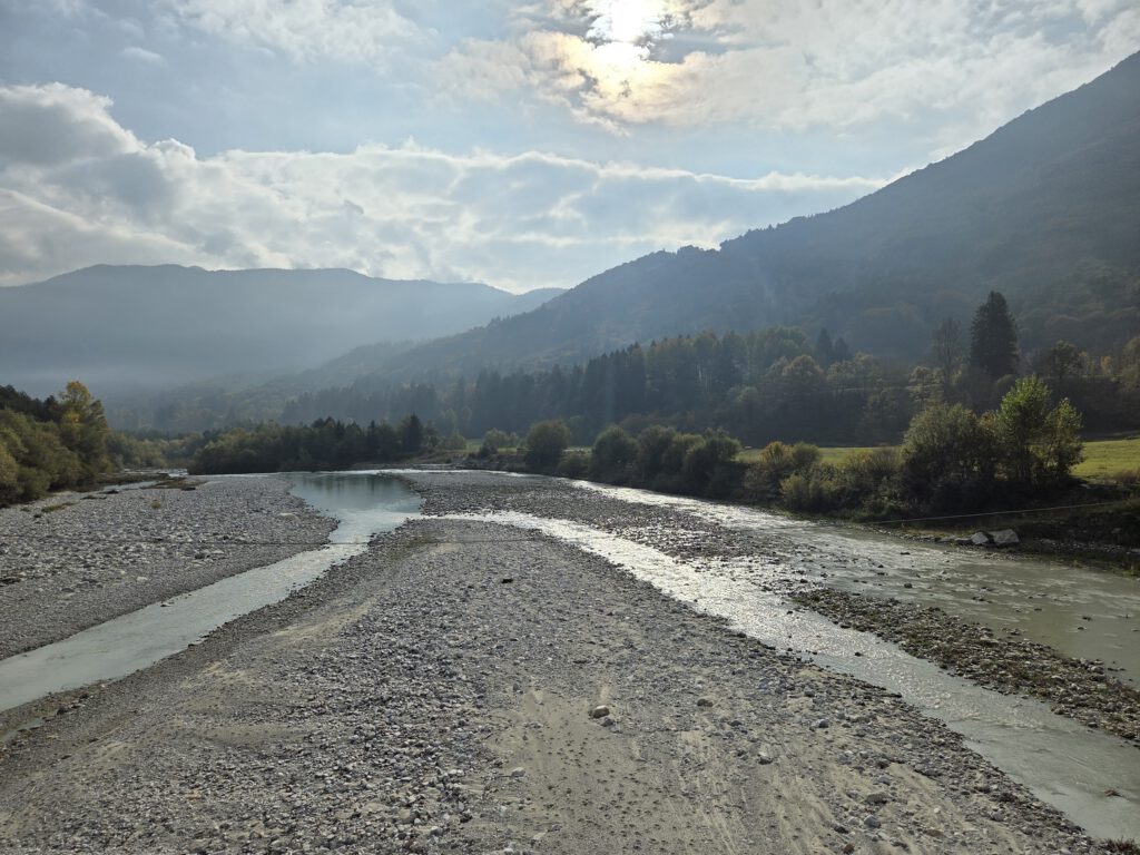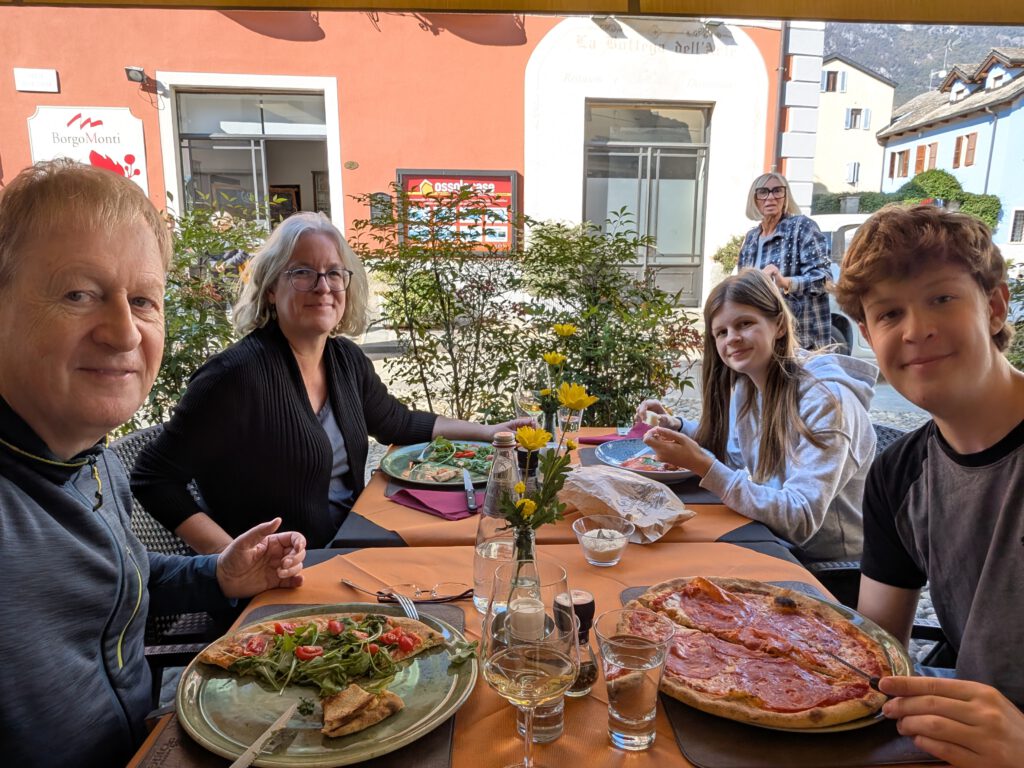 In Domodossola kommen wir um 11.40 Uhr an und haben bis 13.36 Uhr Zeit. Kilian wählt souverän nicht nur eine hervorragende Pizzeria aus, sondern auch noch eine mit Kirchenblick – er kennt seine Mutter schon länger. Louisa schmaust eine Lasagne, der Rest isst Pizza, es gibt ein Gläschen Wein und Espresso. Nicht nur lecker, sondern im Vergleich zu Locarno auch so unglaublich günstig … Wir bestaunen erst eine Gottesanbeterin, dann die Kirche nebenan, noch schnell ein Eis und es geht durch die angenehme Kleinstadt schon wieder zum Bahnhof.