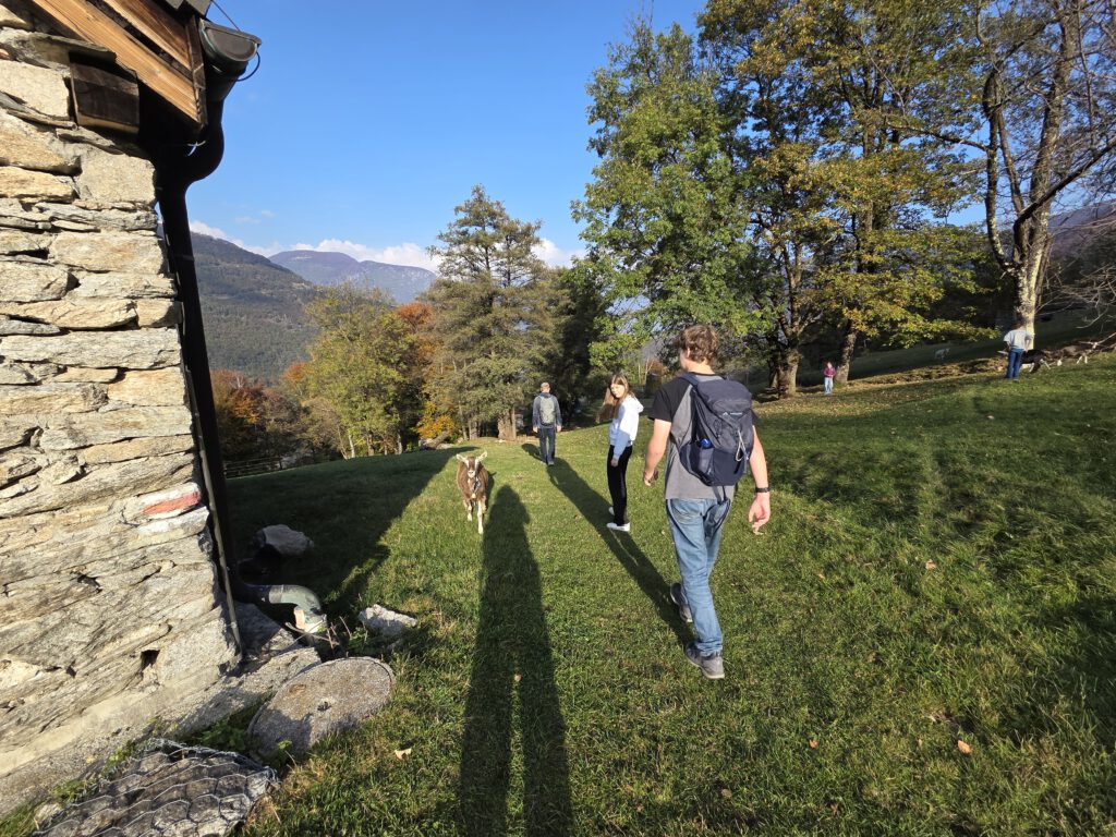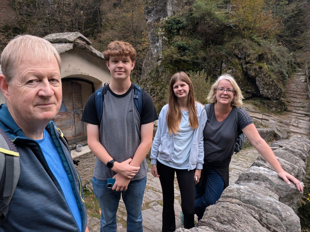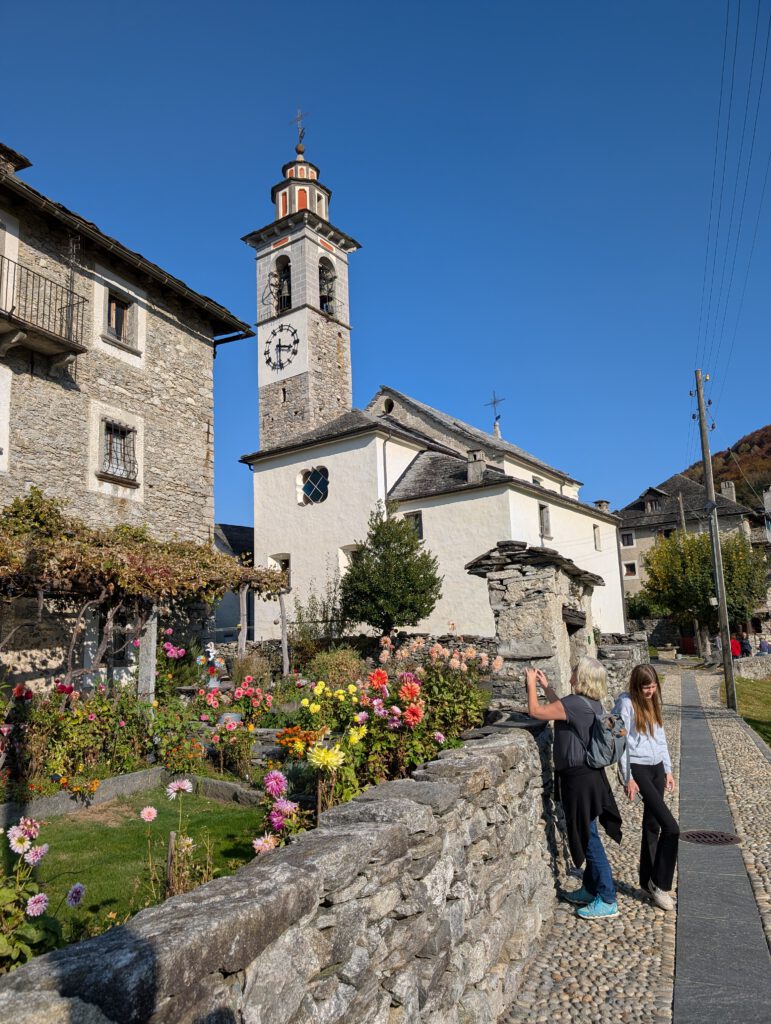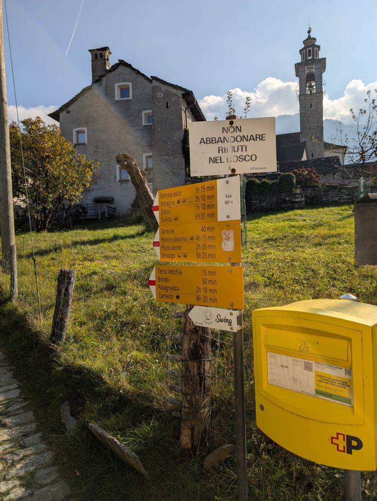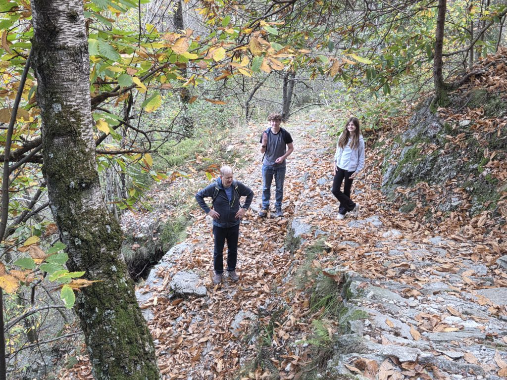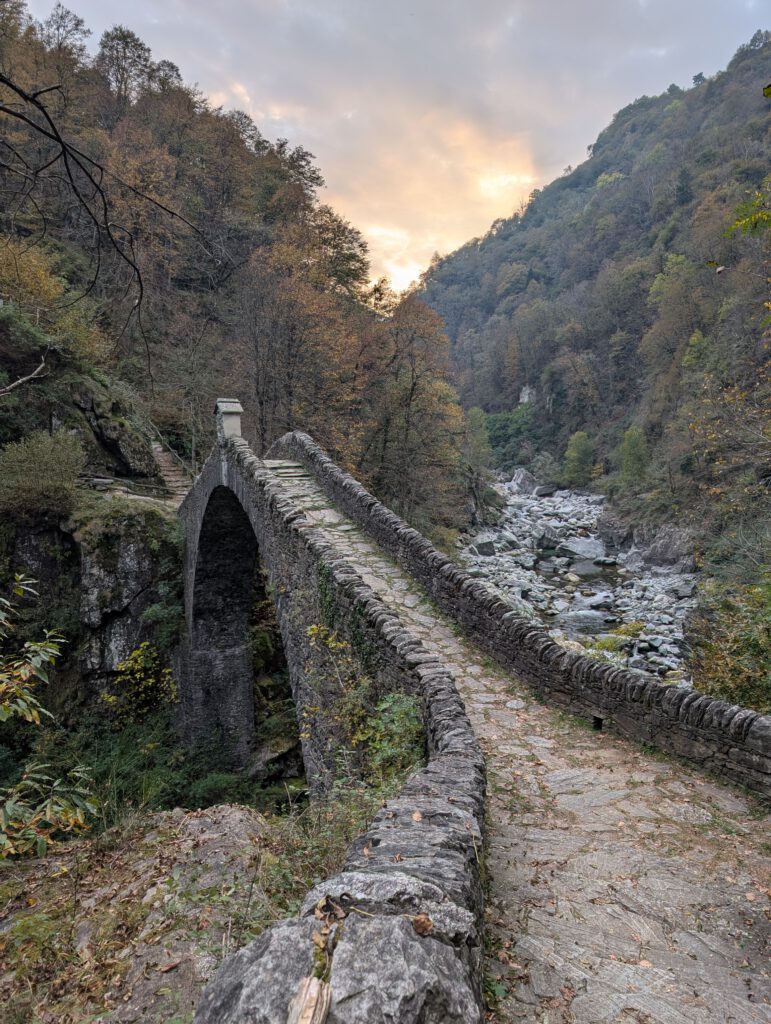 Wir kommen im Weiler Rasa an, einer der letzten autofreien Orte der Schweiz. Ein ruhiges Idyll, durch das wir eine Runde bummeln. Danach wollen wir nach Intragna wandern und wieder mit dem Zug nach Locarno zurück. Und in Schweizer Wanderblog hieß es auch, eine absolut familientaugliche kleine Wanderung … Dabei überliest man leicht, dass es sehr zügig knackige 600 Meter nach unten geht. Sehr steil, dass auf den Felsen eine zentimeterdicke Schicht an Maronenlaub liegt, macht es nicht leichter. Das braucht Zeit und strengt alle vier ziemlich an, vor allem die zwei, die nicht als Bergziegen auf die Welt gekommen sind. Fast wollen wir schon aufgeben und eine Station früher zur Bahn – aber dann wird der Weg noch schön und sehr angenehm. Bis zur steinernen Brücke, als es noch einmal steil bergauf geht … Um 18.30 Uhr sitzen wir komplett geschafft am Bahnhof in Intragna und warten auf den Zug zurück, der um 18.58 Uhr kommt. Die App auf dem Handy jubelt: 20.000 Schritte!