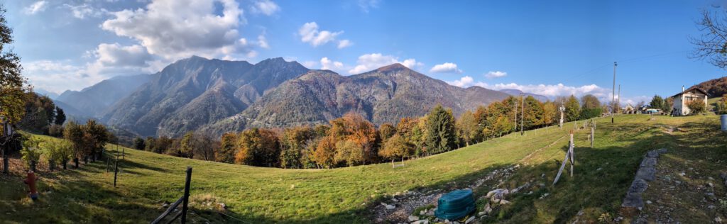 In Camedo steigen wir uns und nehmen für zwei Stationen die Regionalbahn nach Varesio. Der komfortableste Zug der ganzen Fahrt, übrigens. Leise, großzügige Sitzplätze, die noch dazu bequemer sind. In Verdasio steigen wir aus und direkt um in die kleine, alte Seilbahn, die auf die andere Seite des Tales führt. Ein Paar mit zwei kleinen Kindern sitzt schon, mit uns Vieren dazu ist es ganz schön kuschelig. Man kauft ein Ticket am Automaten und startet dann die Bahn, kontrolliert wird auf der anderen Seite. Die Sicht ist durchaus beeindruckend ..,