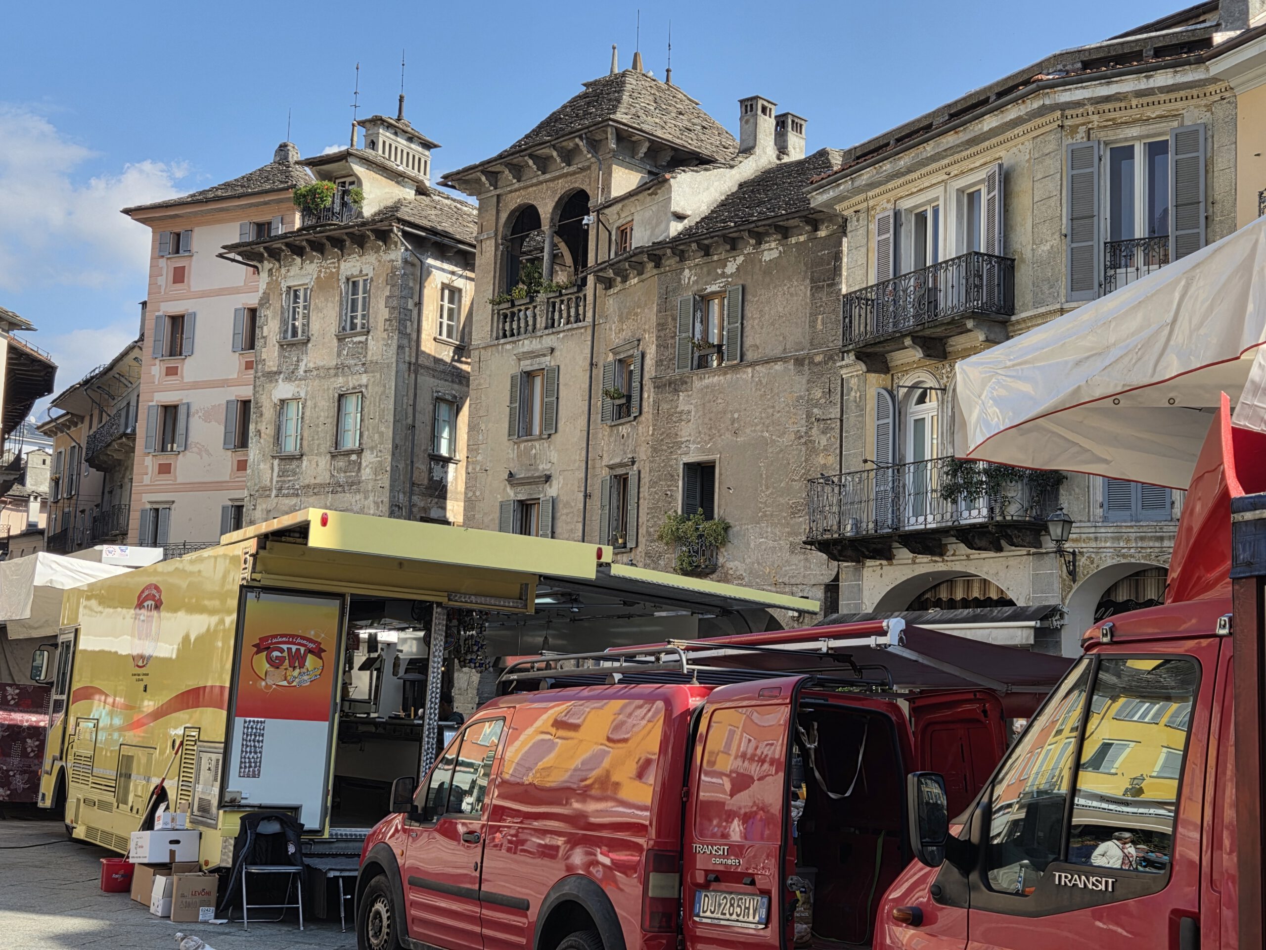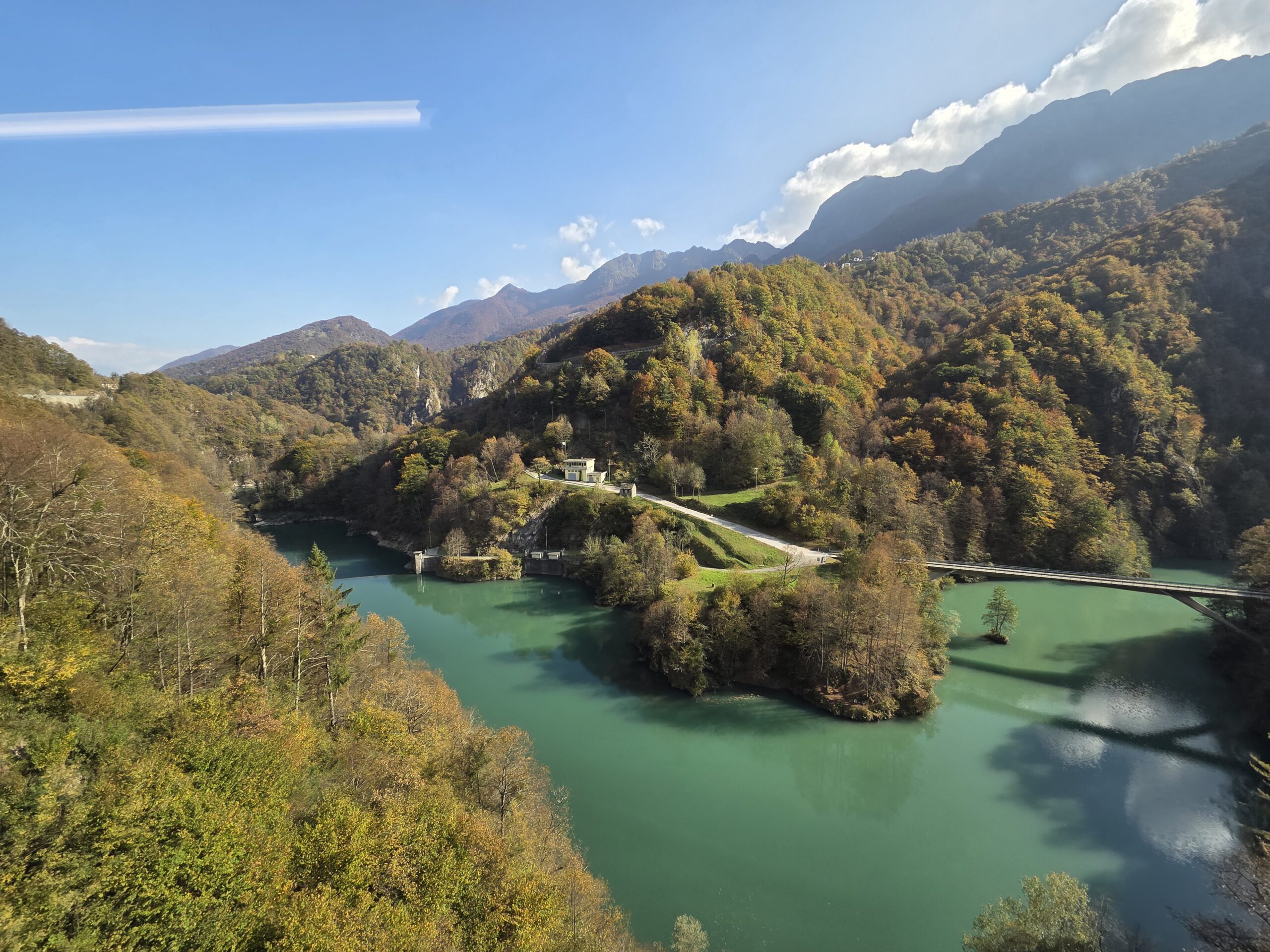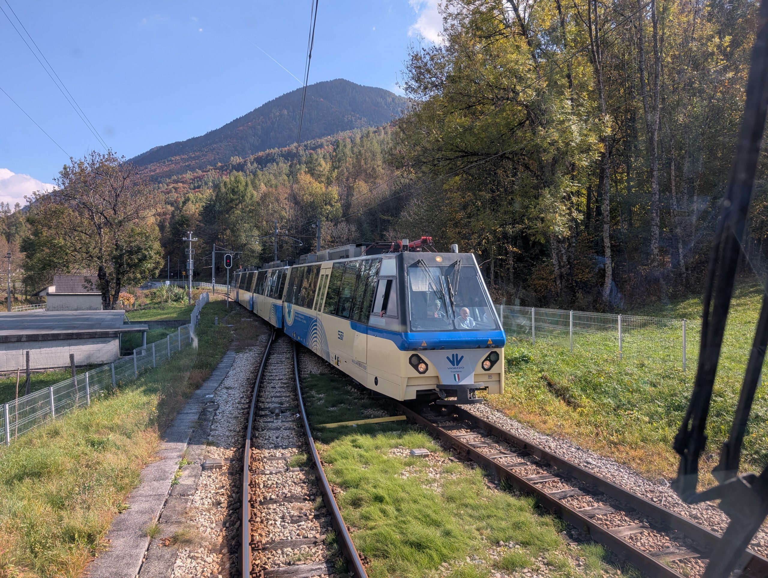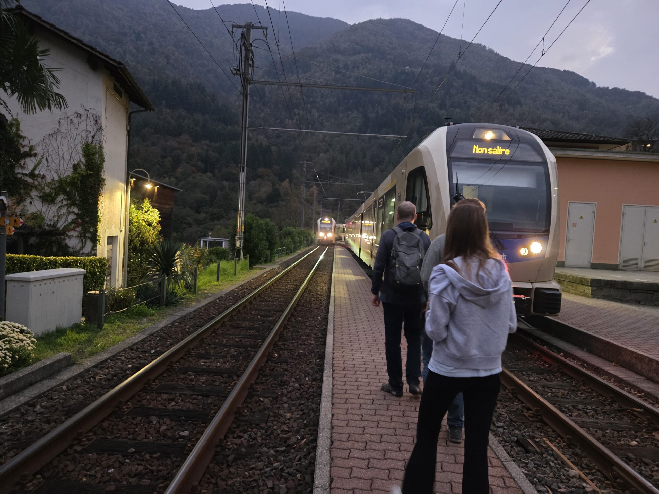 … Am Mittwochabend wissen wir, warum die Frau am Ticket-Schalter so beeindruckt war. Zuvor hatte der Tag vergleichweise früh begonnen, schon um kurz nach 9 Uhr sind wir unterwegs zum Bahnhof. Dort startet um 9.51 Uhr unsere Fahrt mit der Centovalli-Bahn, die Locarno und das italienische Domodossola verbindet. Innerhalb von zwei Stunden gibt es 83 Brücken und 31 Tunnel, die Strecke gilt als eine der schönste der Welt. Der Stadtbahnhof ist inzwischen unterirdisch und im Vergleich zur 102 Jahre alten Zuglinie eher futuristisch. Die Hinfahrt verbringen wir auf unseren reservierten Plätzen in einem der ganz alten Züge, der viel Flair, aber auch viel Lärm zu bieten hat. Sehr entschleunigt, viel Herbstlaub, Wasserfall, Flussausblick, Bauarbeiter usw. Es wird nicht langweilig.