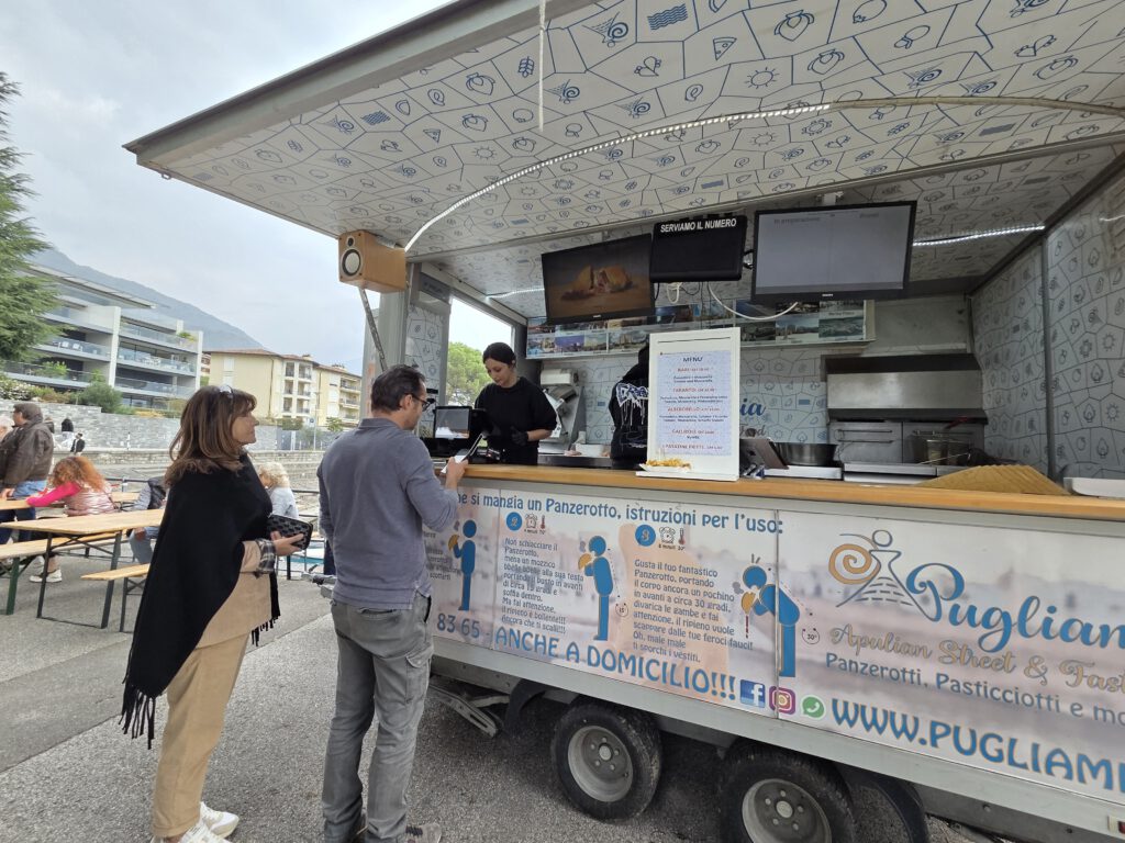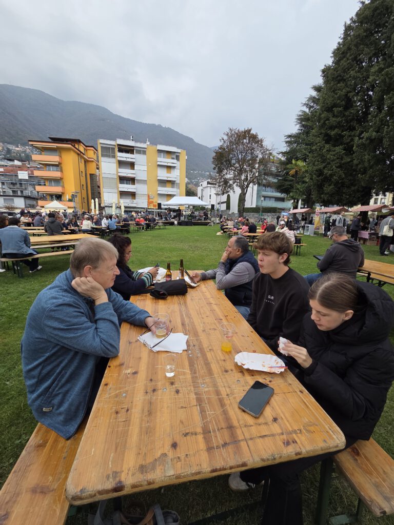 Als wir Richtung Seeufer bummeln hören wir erst einen Schlagersänger aufspielen. Doch dann wird es, quasi von einer kleinen Bühne aus als Konkurrenz, rockig: „Bier, Käse, Honig – am Meer“. Viele Stände mit Honig und Käse, einige Stände mit lokalem Bier, zwei Stände mit Wein und ein Stand mit Streetfood aus Apulien, gefüllten Teigtaschen. Und da sind sie dann auch, die Locarner, viele davon gleich mit einer ganzen Flasche Rotwein auf dem Biertisch. Die Band rockt sich durch die größten Hits der letzten Jahrzehnte, manche Besucher tanzen sogar. Idealer Ort für eine kleine Mittagsrast.