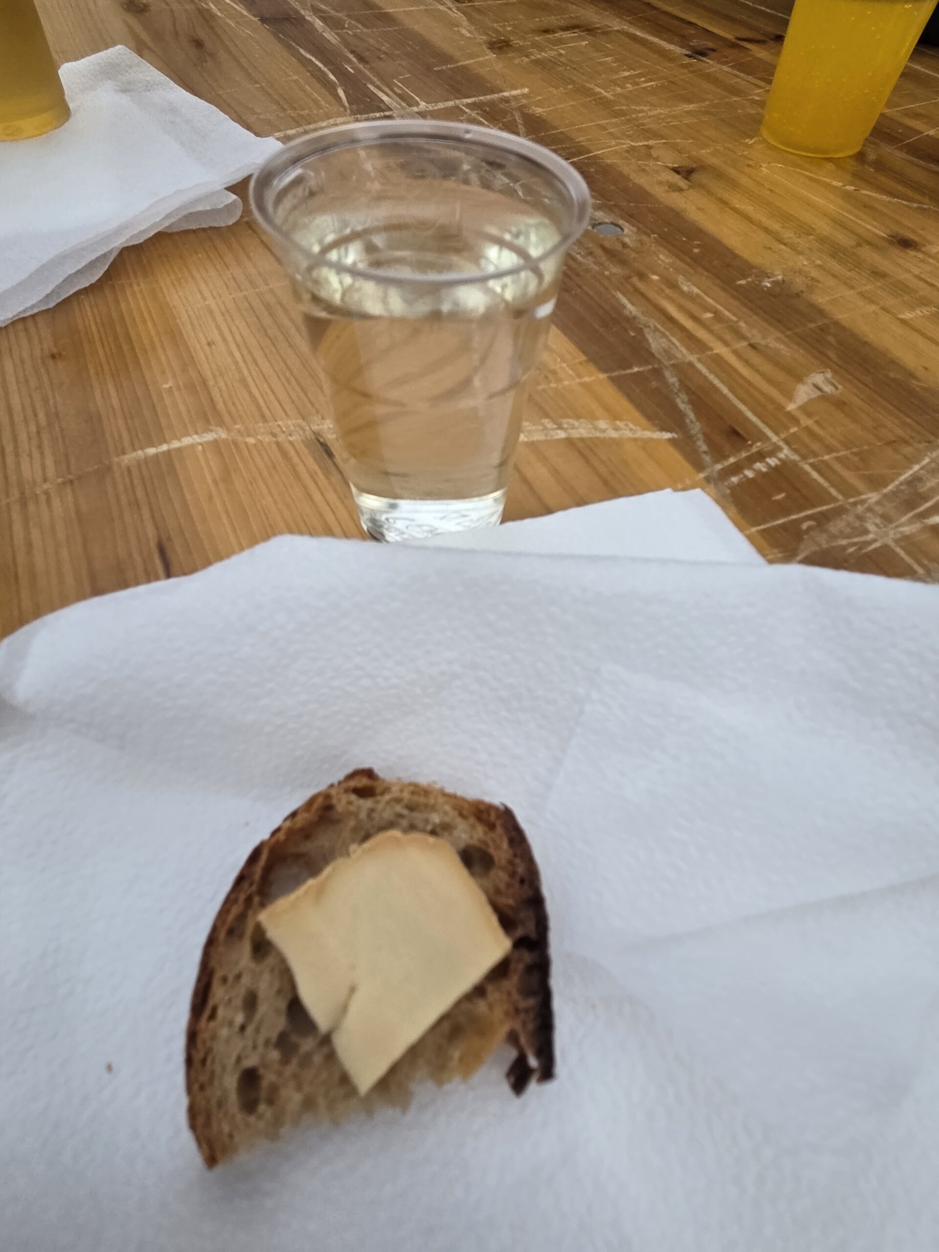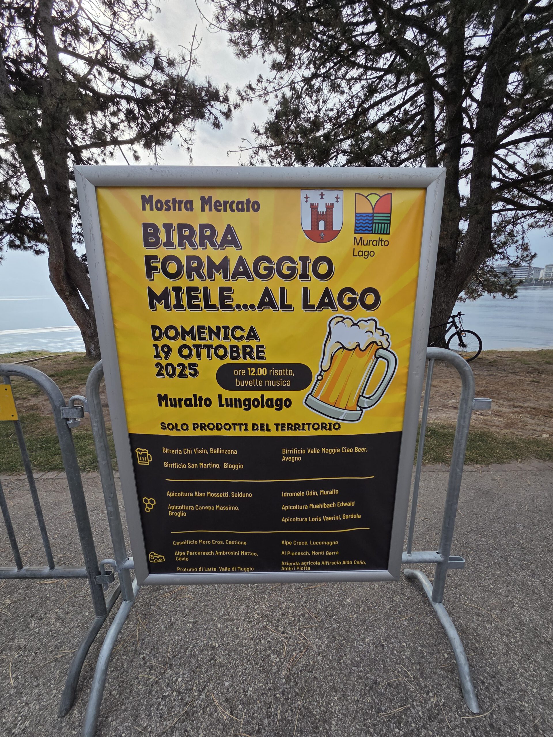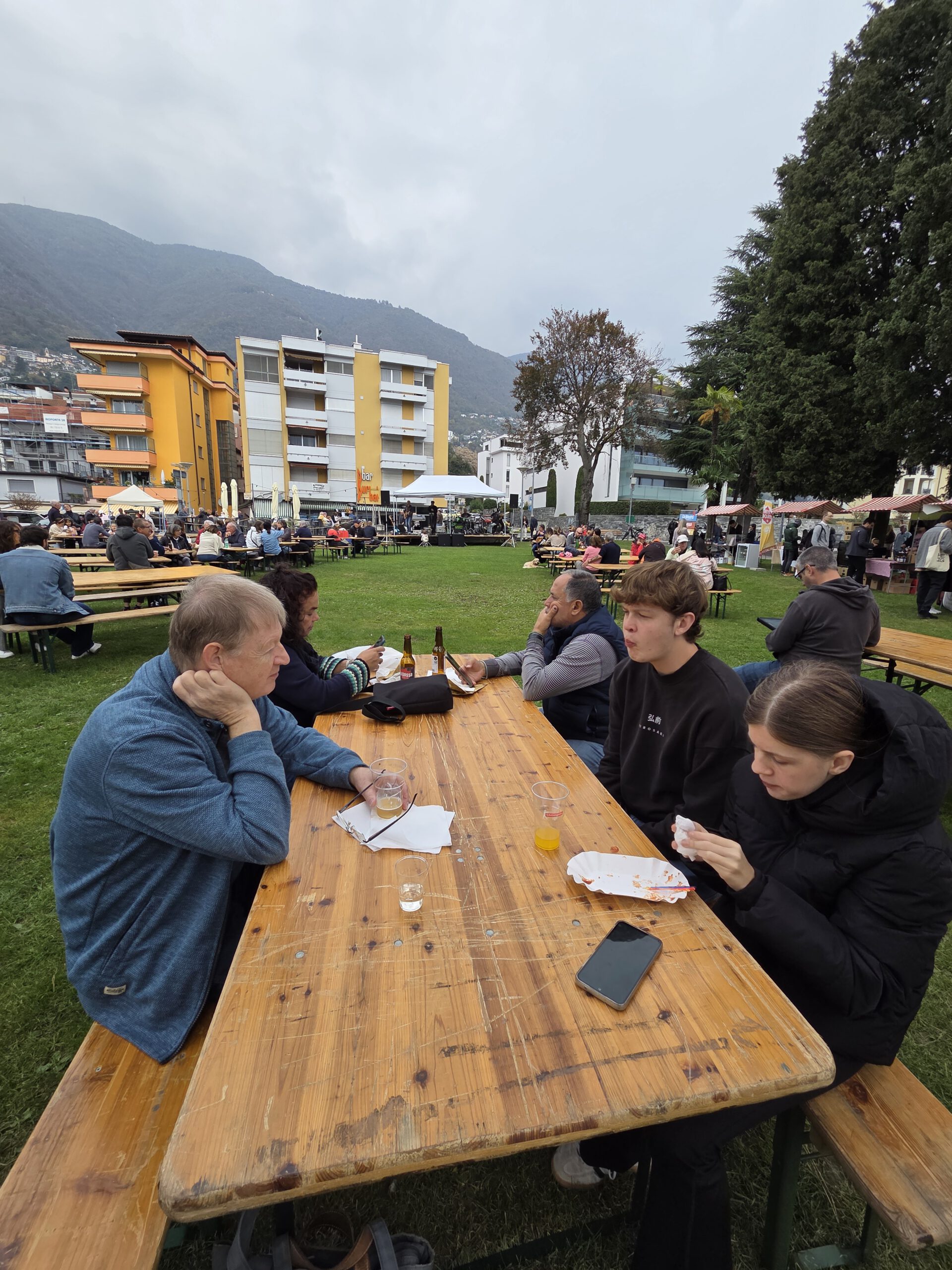 Als wir Richtung Seeufer bummeln hören wir erst einen Schlagersänger aufspielen. Doch dann wird es, quasi von einer kleinen Bühne aus als Konkurrenz, rockig: „Bier, Käse, Honig – am Meer“. Viele Stände mit Honig und Käse, einige Stände mit lokalem Bier, zwei Stände mit Wein und ein Stand mit Streetfood aus Apulien, gefüllten Teigtaschen. Und da sind sie dann auch, die Locarner, viele davon gleich mit einer ganzen Flasche Rotwein auf dem Biertisch. Die Band rockt sich durch die größten Hits der letzten Jahrzehnte, manche Besucher tanzen sogar. Idealer Ort für eine kleine Mittagsrast.